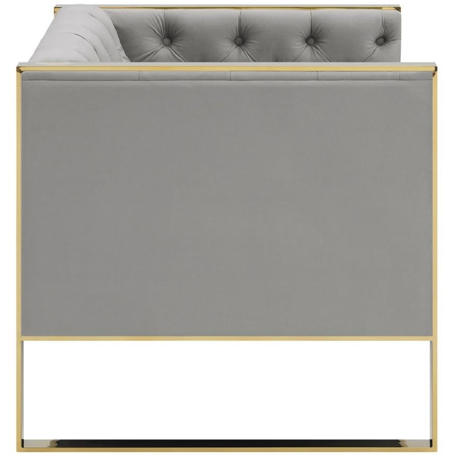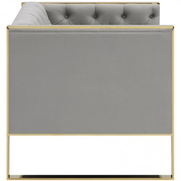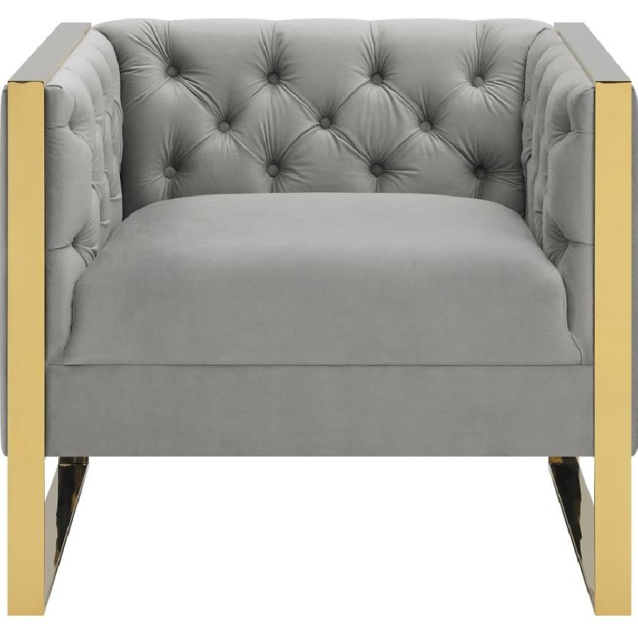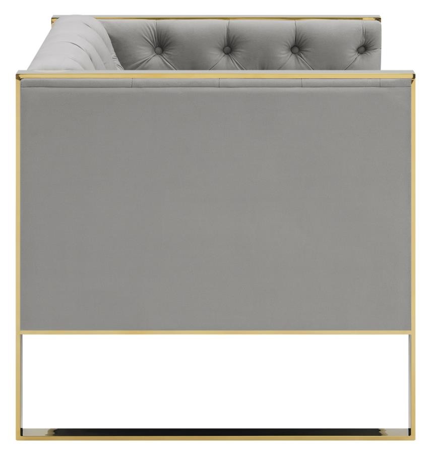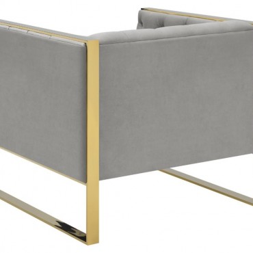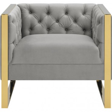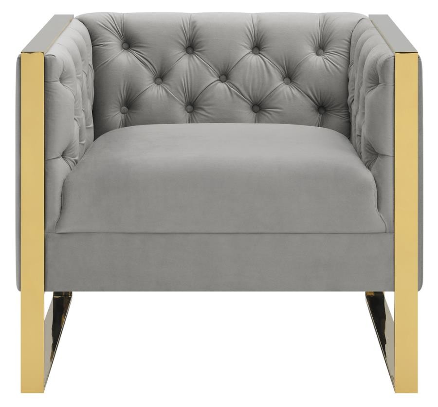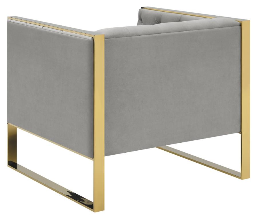 A blend of contrasting tones and materials will make this modern two-tone accent chair a mainstay in your home. It's upholstered in button tufted soft velvet in an elegant light grey finish that matches most any decor. A gold stainless steel base wraps around the arms and forms sturdy U-shaped legs. It's a feast for all your senses as you sit back and enjoy this cozy chair after a hard day. It's designed to be as at home in a modern living room or den as it is in an eclectic home library or entertainment room.