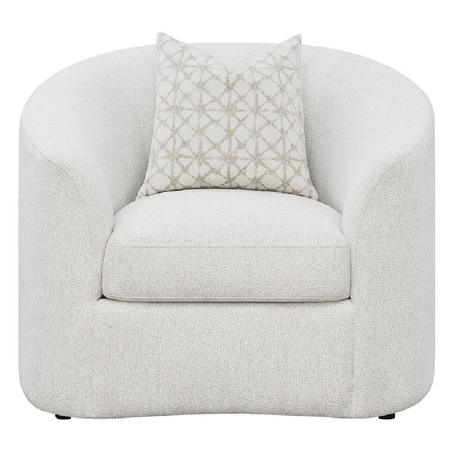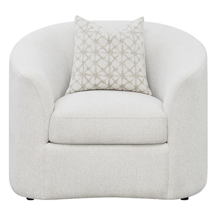 This boucle accent chair adds warmth and sculptural charm to any living space. Upholstered in soft latte boucle fabric, it features an elegant curved silhouette with sloped armrests and a smooth tight back for a clean, tailored appearance. A plush seat cushion provides superior comfort, while the included accent pillow with faux down fill enhances coziness and sophistication. Perfect for reading nooks, lounges, or living rooms, this chair combines timeless texture with modern mid-century flair.