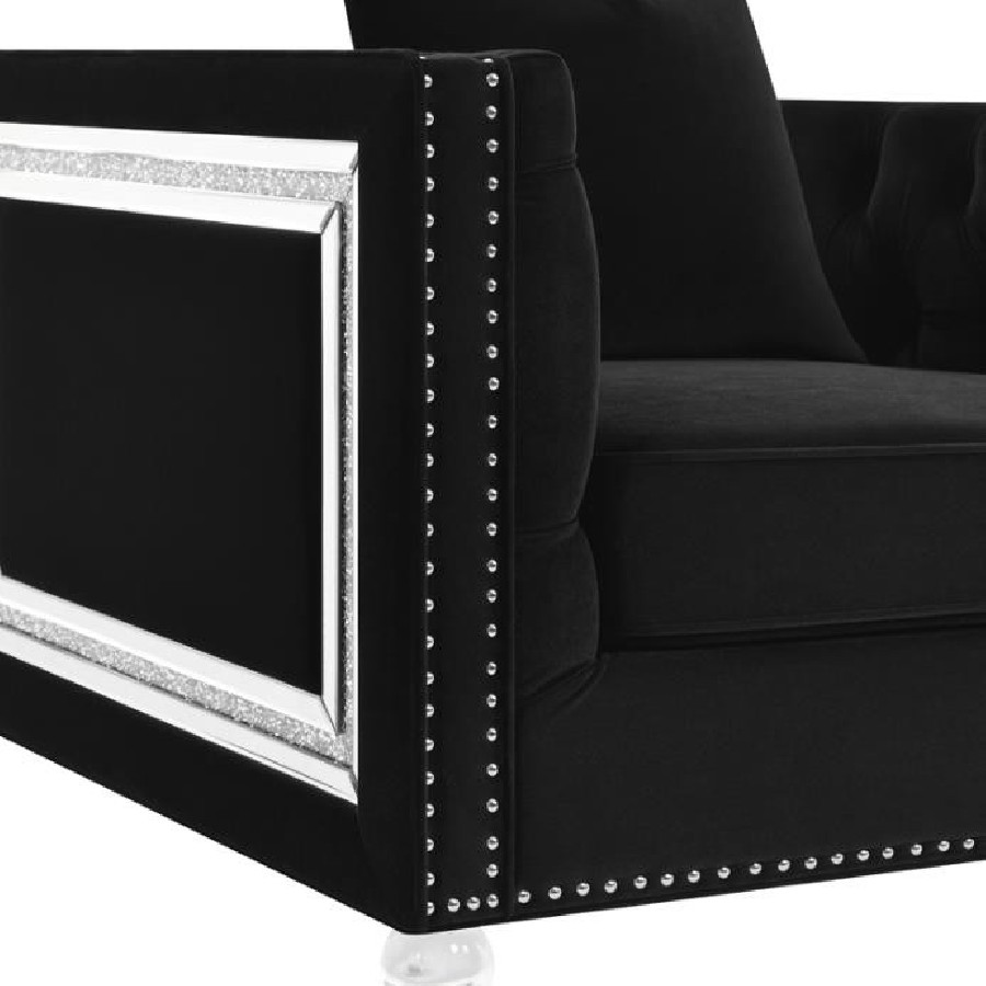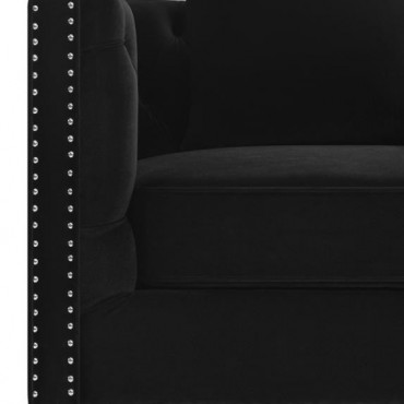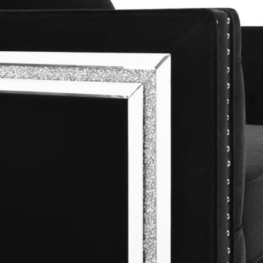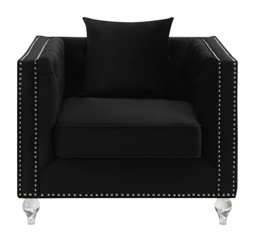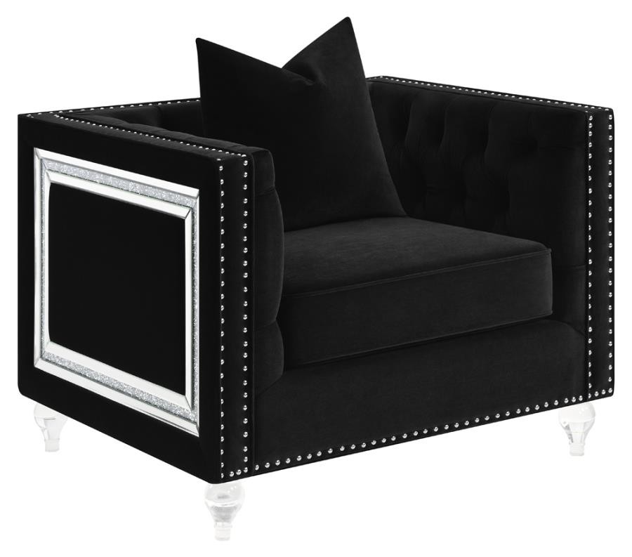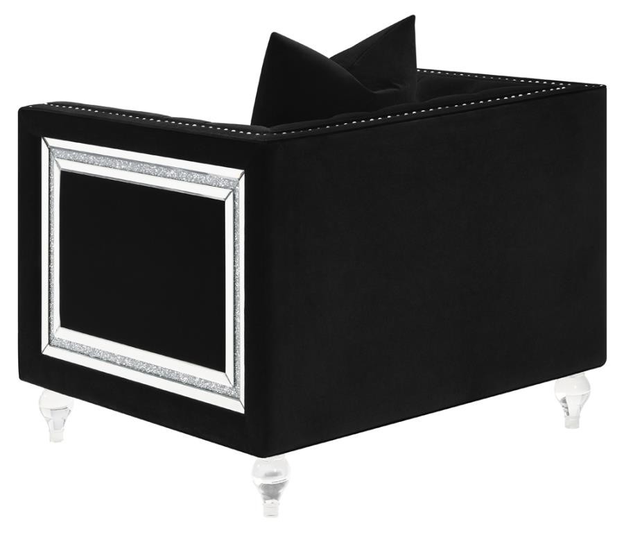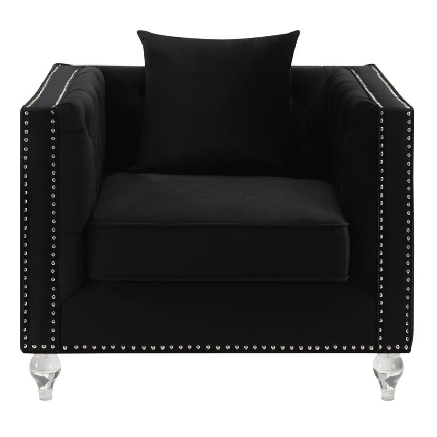 Elevate your living room's style with this tuxedos style club chair. Featuring a classic button tufted interior backrest and squared, straight arms, this chair offers a refine, timeless look that blends into a modern decor. Accented with sparkling individually hammered nailhead trim and turned acrylic legs, this chair lends an elegance like no other. Each arm also features window shape accent with lustrous mitered mirror and acrylic crystal frame inset, adding a Hollywood regency flair. Perfectly suited for contemporary living rooms and seating areas, this glamorous club chair is also wrapped in a deep black velvet upholstery, allowing it to complement color palettes and match existing decor tastes.