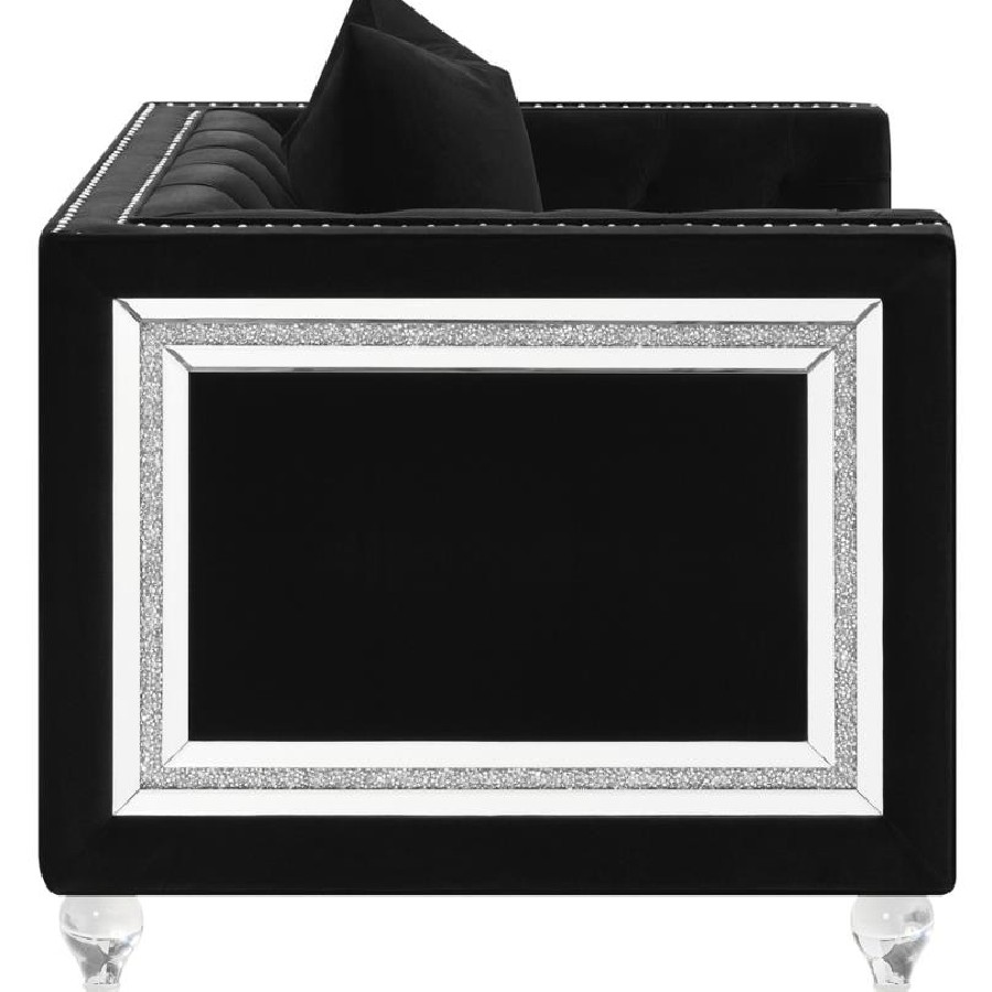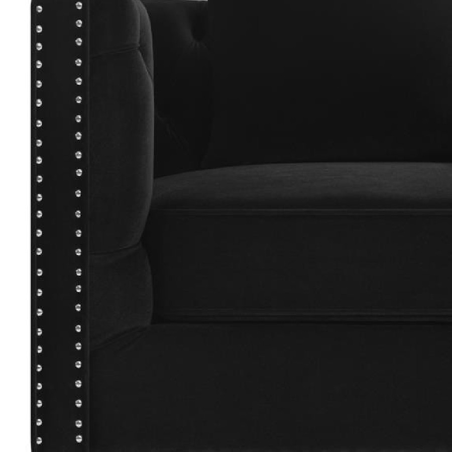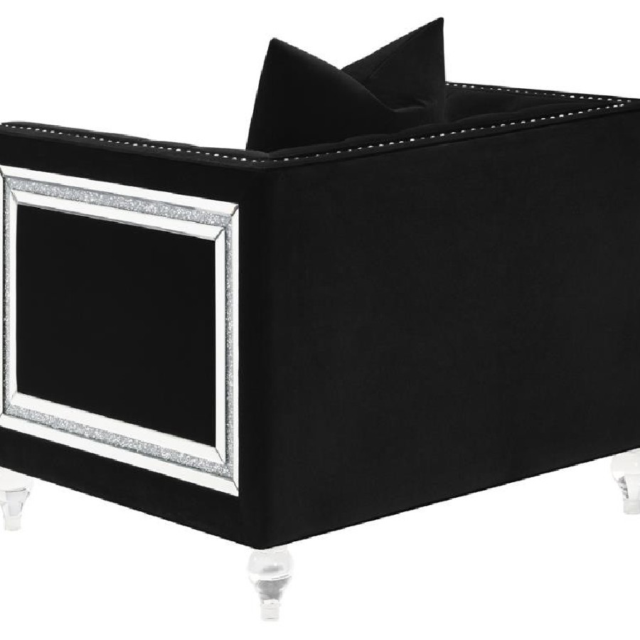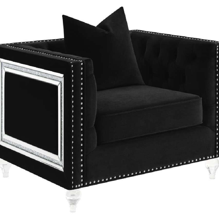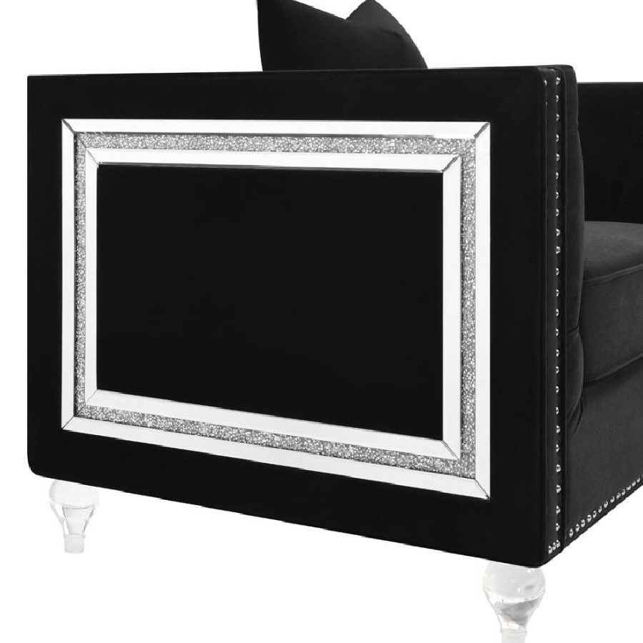 Elevate your living room's style with this tuxedos style club chair. Featuring a classic button tufted interior backrest and squared, straight arms, this chair offers a refine, timeless look that blends into a modern decor. Accented with sparkling individually hammered nailhead trim and turned acrylic legs, this chair lends an elegance like no other. Each arm also features window shape accent with lustrous mitered mirror and acrylic crystal frame inset, adding a Hollywood regency flair. Perfectly suited for contemporary living rooms and seating areas, this glamorous club chair is also wrapped in a deep black velvet upholstery, allowing it to complement color palettes and match existing decor tastes.