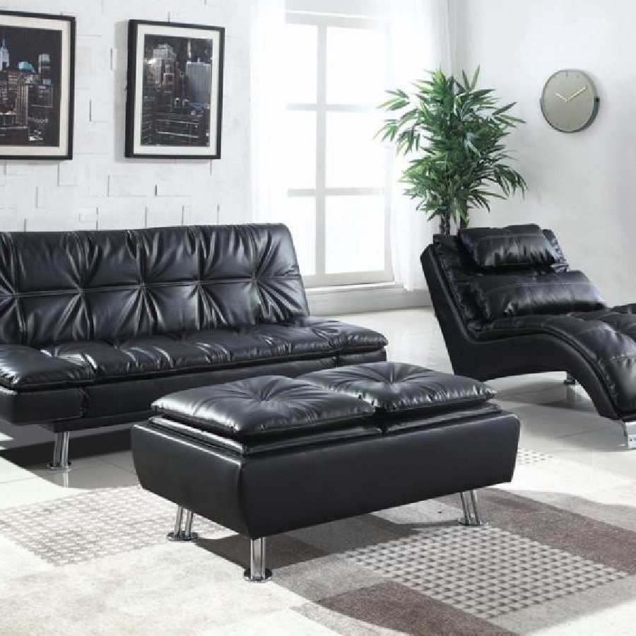 Impart ultimate relaxation with the refined look and plush feel of this upholstered chaise. Square tufting and double row stitching highlight black leatherette upholstery and create dimensionality. Complete with a delightful curve that cradles the body, this chaise is the ideal place to unwind. Pillow cushions add comfort and support just where you need it. Silver-tone feel add a modern touch to a versatile look.