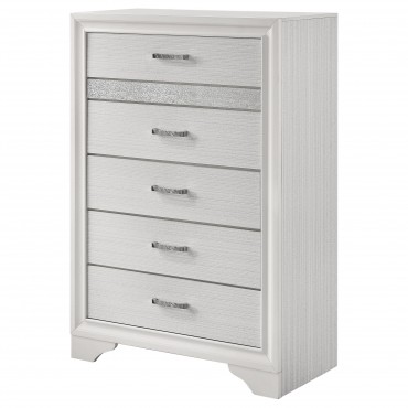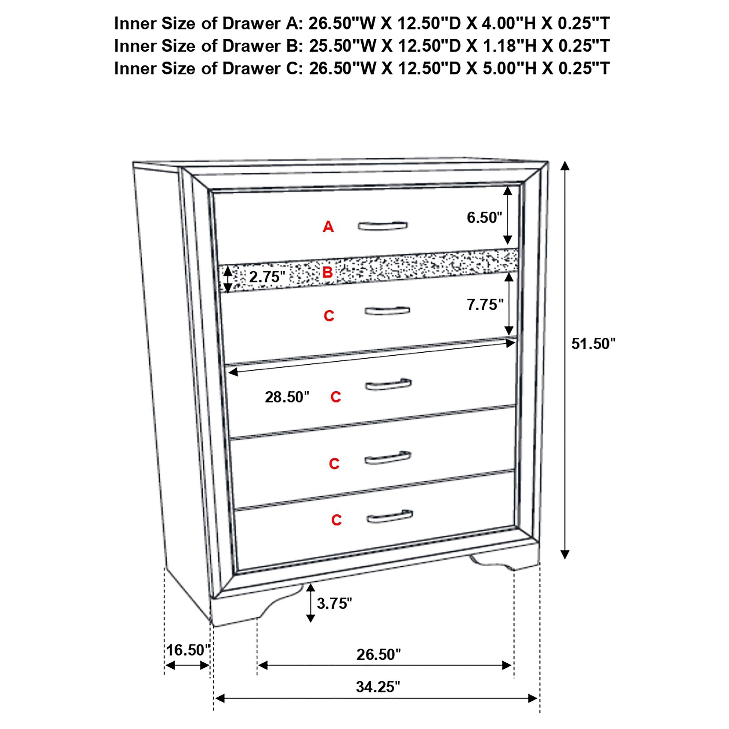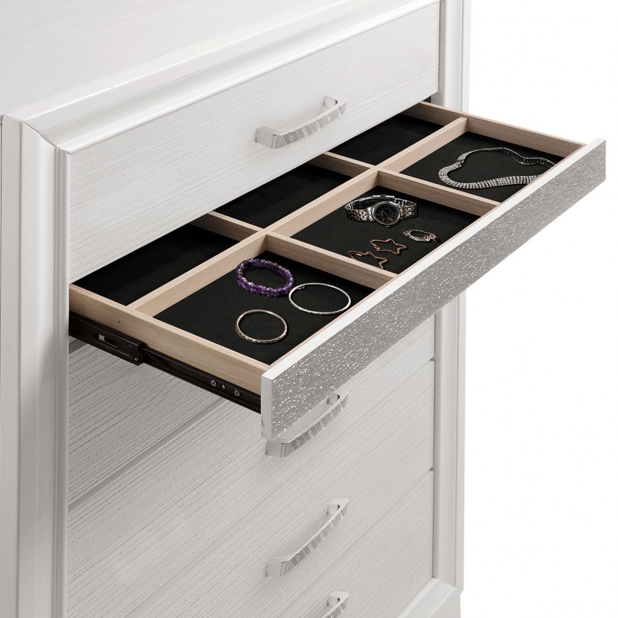 Add posh, upscale ambiance to your bedroom decor. This chic, stylish chest livens up a room with a dazzling touch of sparkle. With a hidden jewelry drawer built in, it keeps valuable items safe and secure. Its drawers are lined with felt for a luxurious hint of softness. Its six convenient drawers are built with metal extension glides for versatile ease of use.