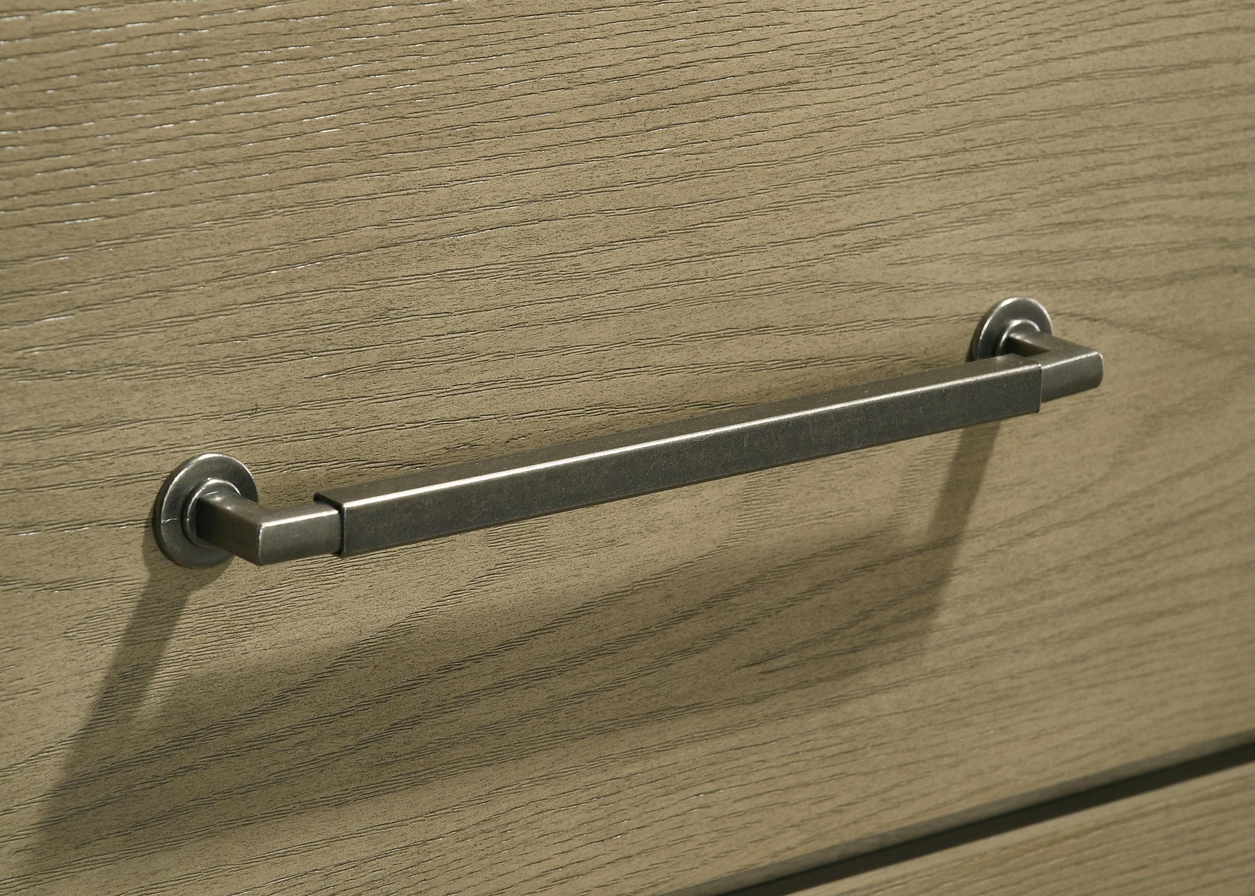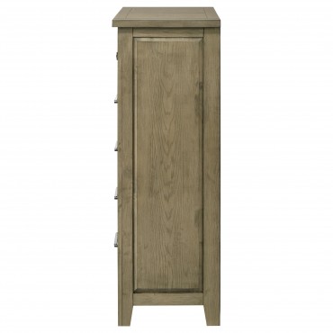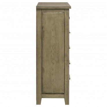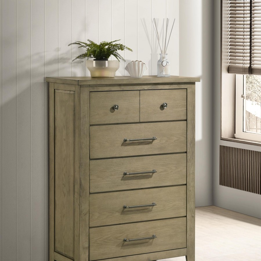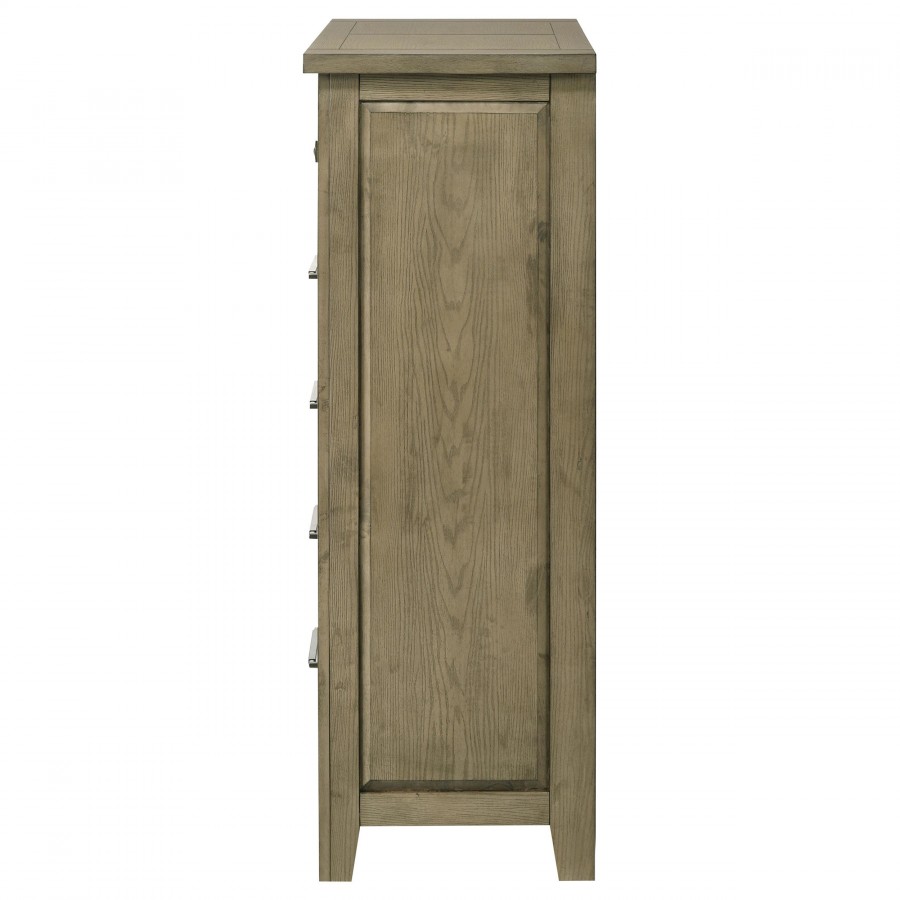 Designed with a relaxed sensibility, this five-drawer chest of drawers blends classic structure with subtle rustic appeal. Its vineyard oak finish highlights the oak grain embossing across solid rubberwood and engineered veneer surfaces. Antique nickel metal knob and pull handles add a touch of industrial charm, while heavy-duty metal ball bearing extension slides ensure smooth, dependable drawer operation. A balanced blend of softness and strength for modern bedroom storage.