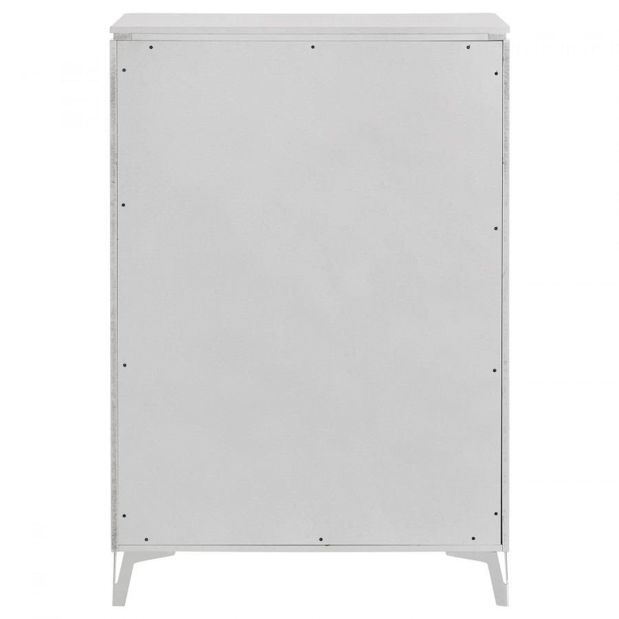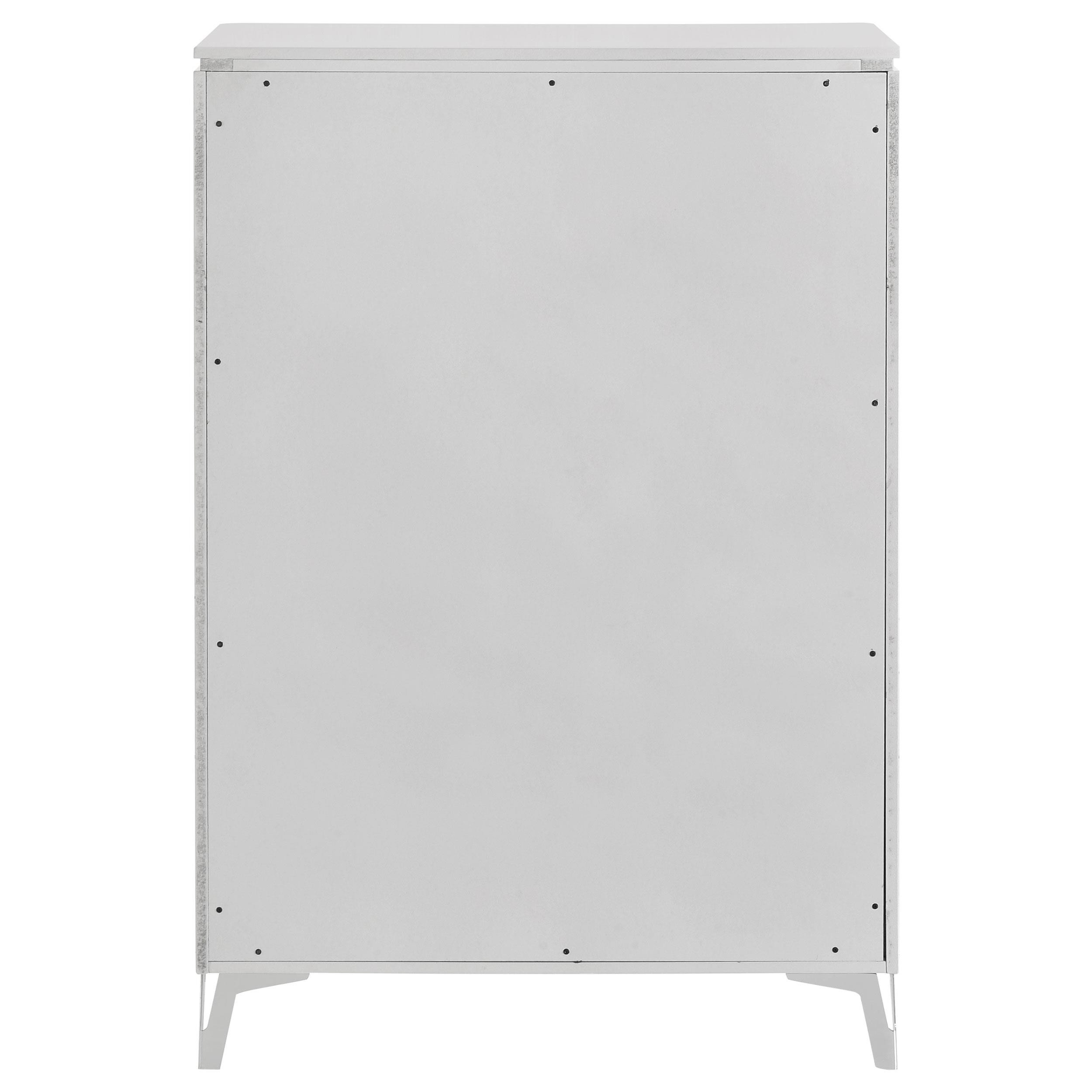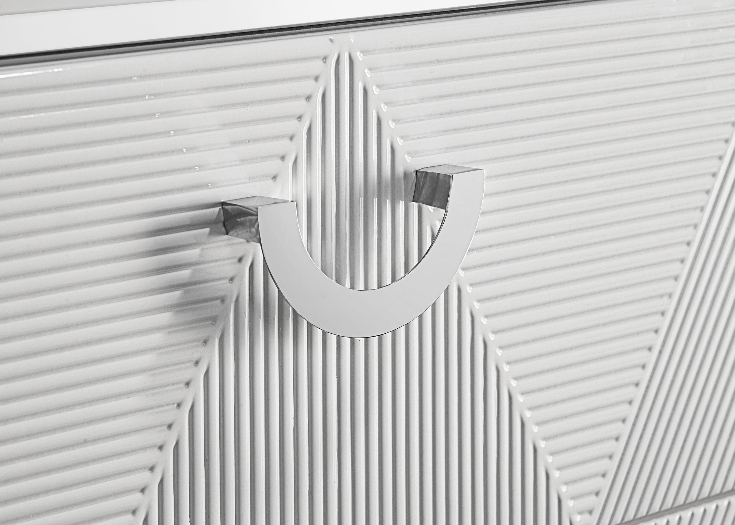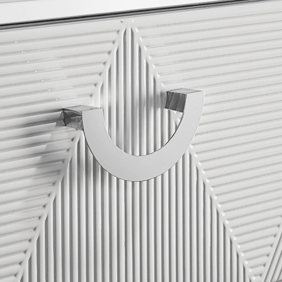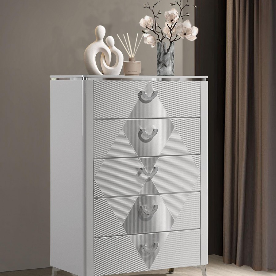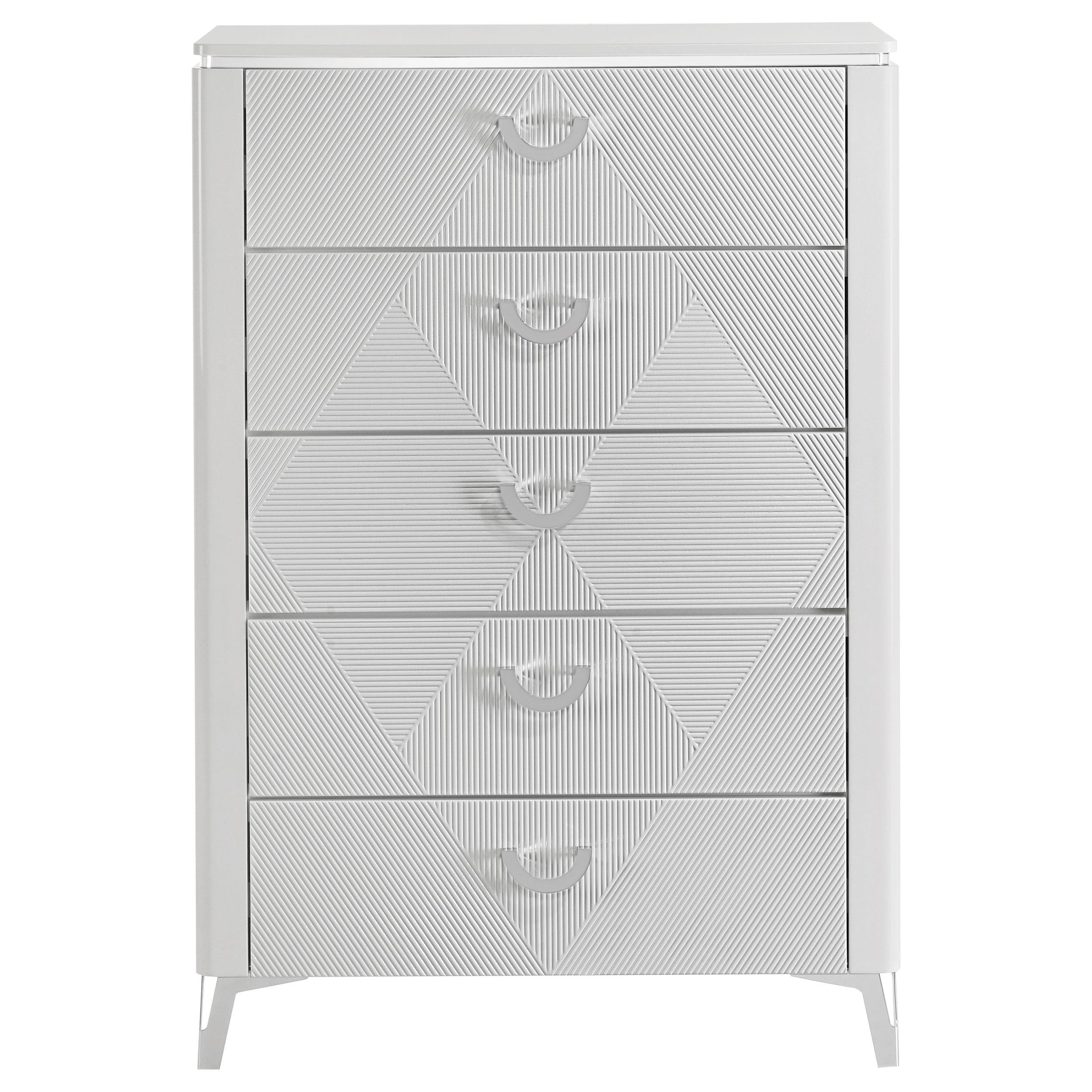 With a sleek high gloss finish and sculptural texture, this five-drawer chest makes a striking addition to the modern bedroom. Its geometric drawer fronts feature ribbed V-patterns that shift across each tier, accented by polished chrome U-shaped pulls. The top drawer is lined in black felt for delicate storage, while all drawers operate smoothly on 45mm metal extension glides. Elevated on tapered chrome-finished legs, this chest offers elevated storage with sharp visual impact.