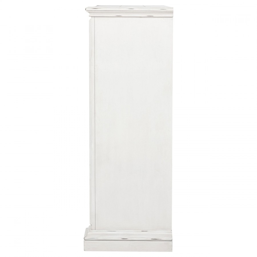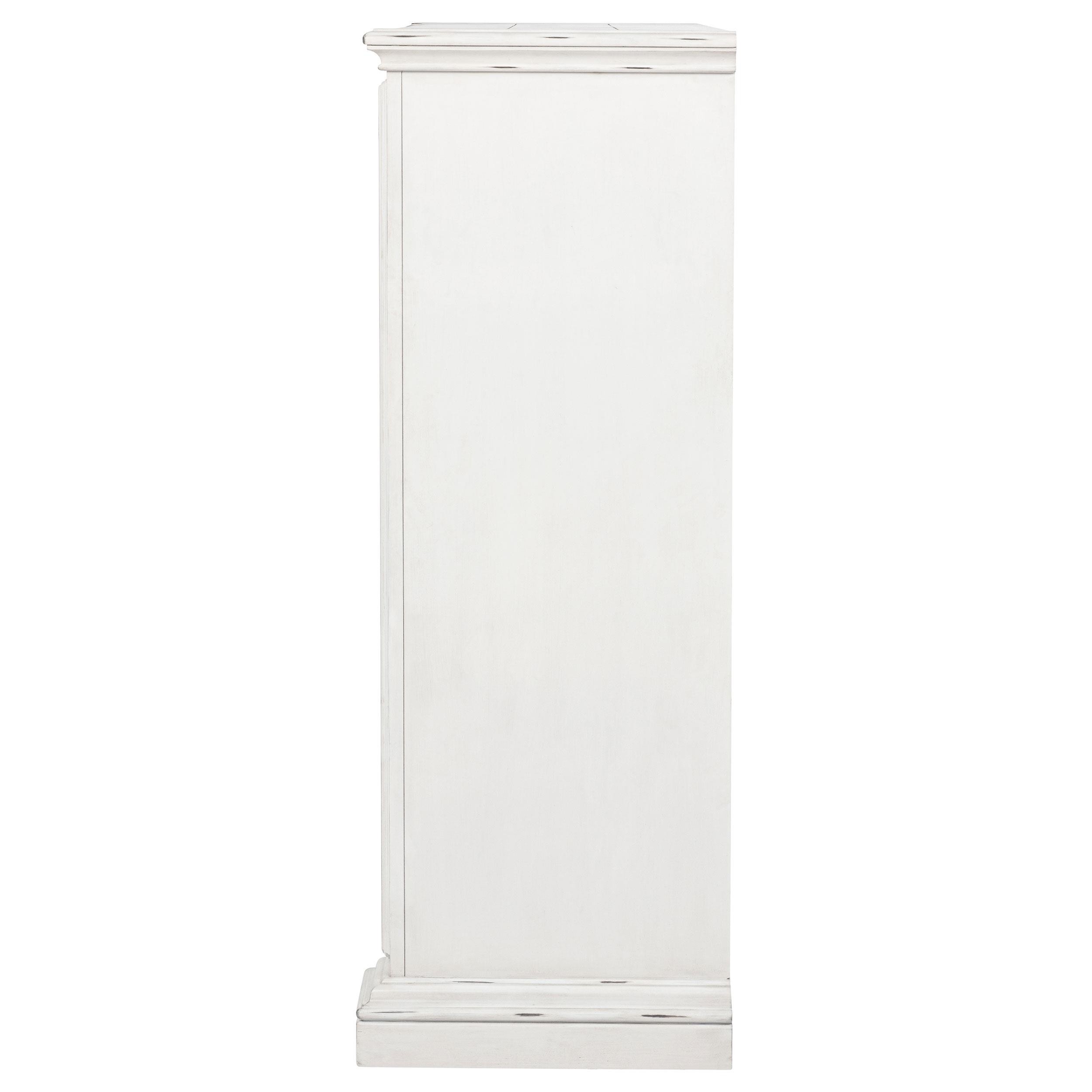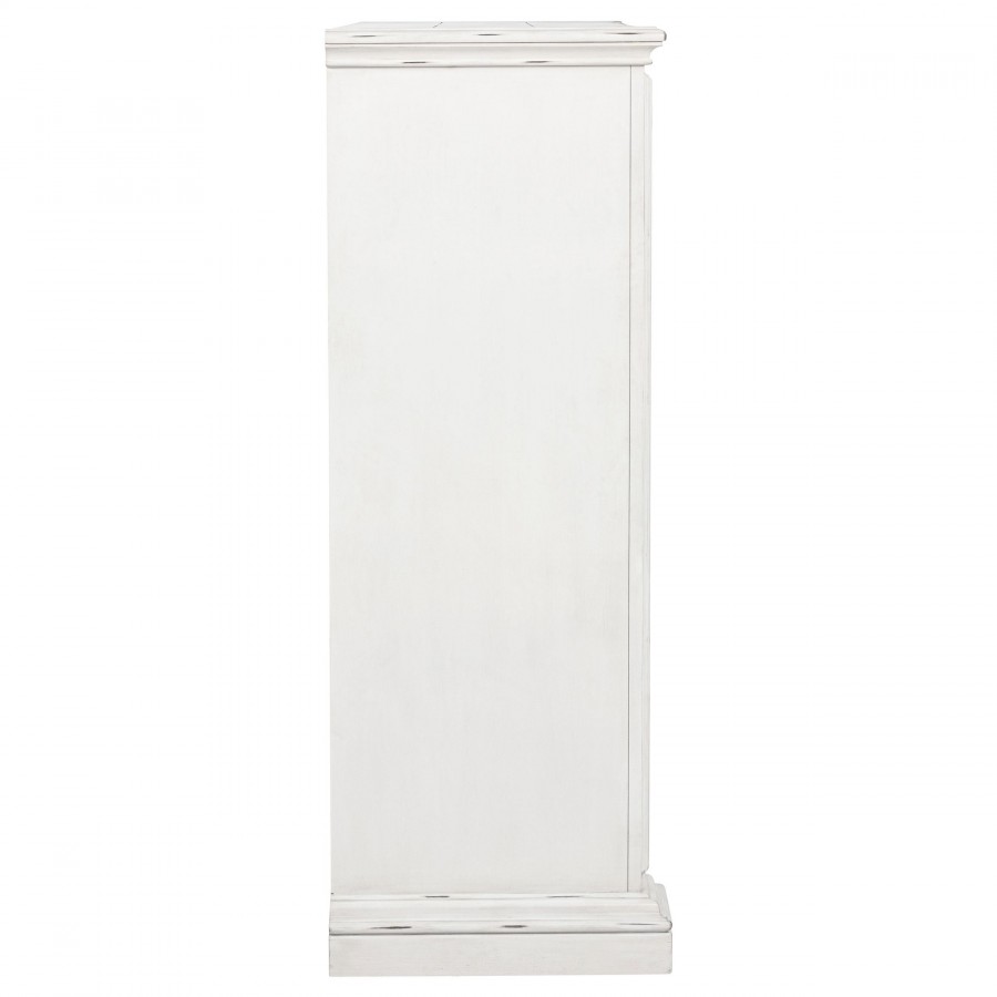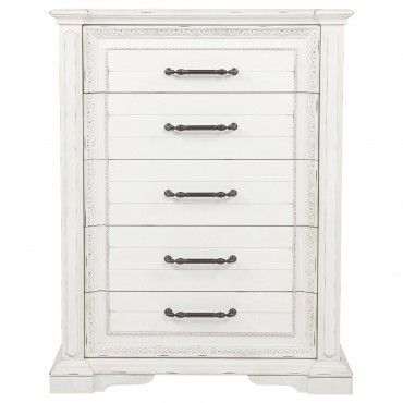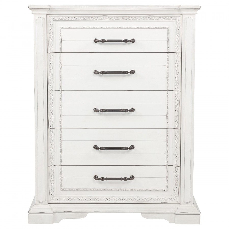Timeless in spirit and refined in detail, this five-drawer chest evokes quiet charm and lasting beauty. A vintage white finish softens its stately frame, while molded edges and antique bronze ring pulls add character and depth. Designed with thoughtful craftsmanship, it offers spacious storage and smooth functionality. Built from poplar, engineered wood, and veneer, it brings elegance and purpose to the bedroom.