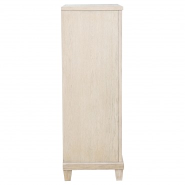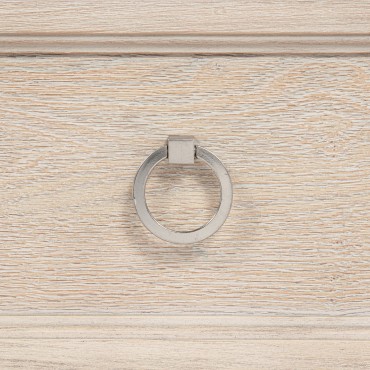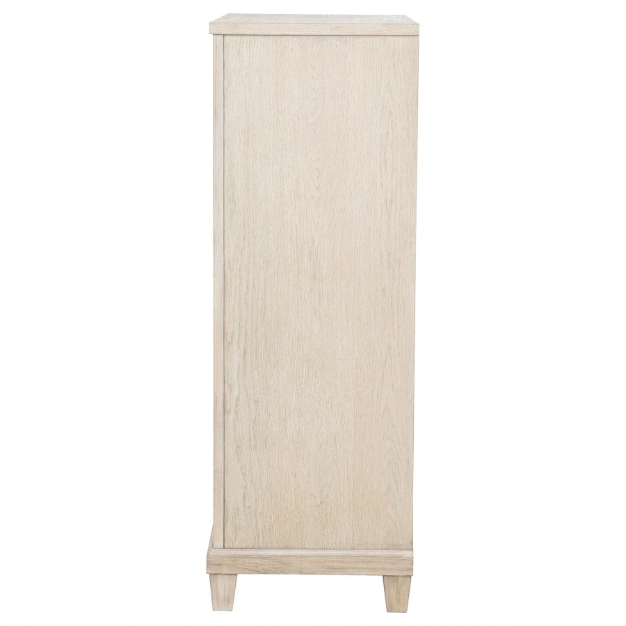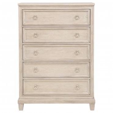 Rooted in timeless grace, this five-drawer chest evokes the quiet elegance of a well-appointed retreat. Gently stepped trim and soft ring-pull hardware lend a sense of heritage, while the washed oak finish whispers of sun worn wood and airy calm. With generous storage hidden behind its refined facade, this piece offers both beauty and intention—crafted to hold life’s essentials while elevating the rhythm of everyday living.