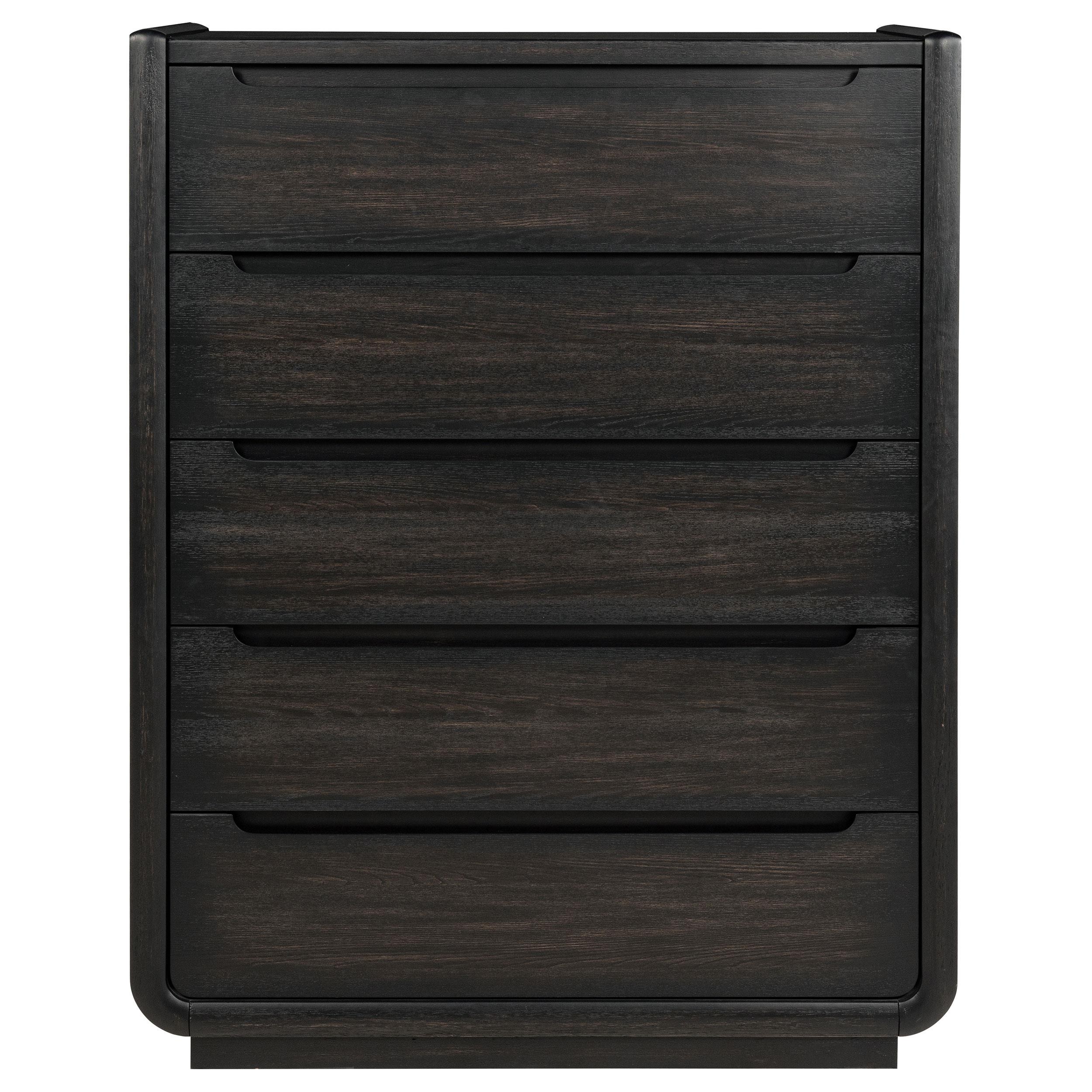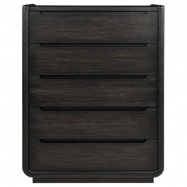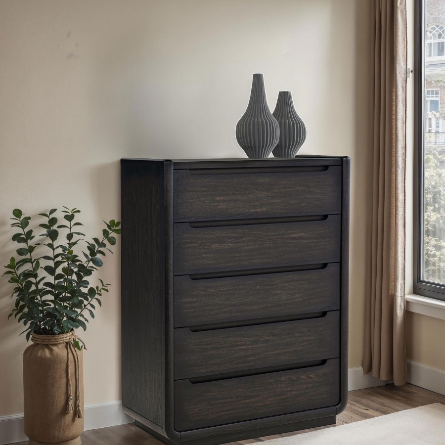 Balance and beauty meet in this five-drawer chest, where softened curves and a deep burnished black finish bring quiet depth to the room. Recessed pulls and rounded corners echo a modern sensibility, while black felt-lined top drawers protect what matters most. Designed with English dovetail joinery, soft-closing glides, and a fully enclosed dust panel, this tall silhouette blends sculptural refinement with everyday function.