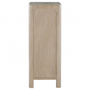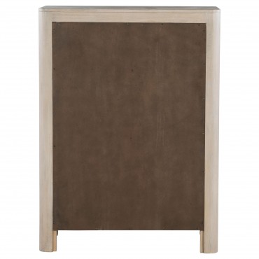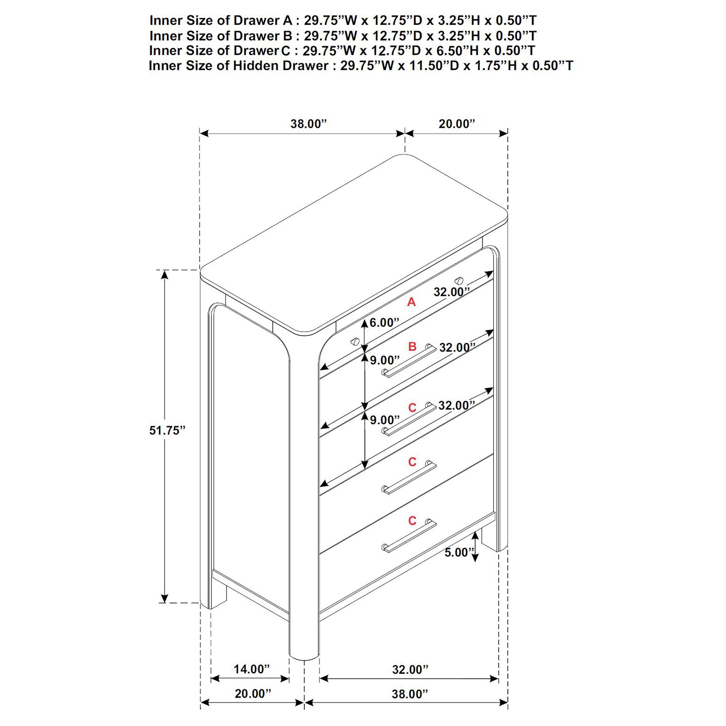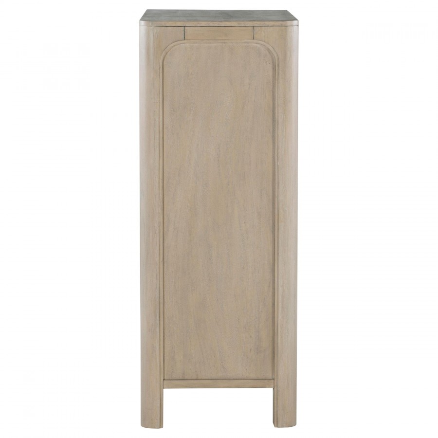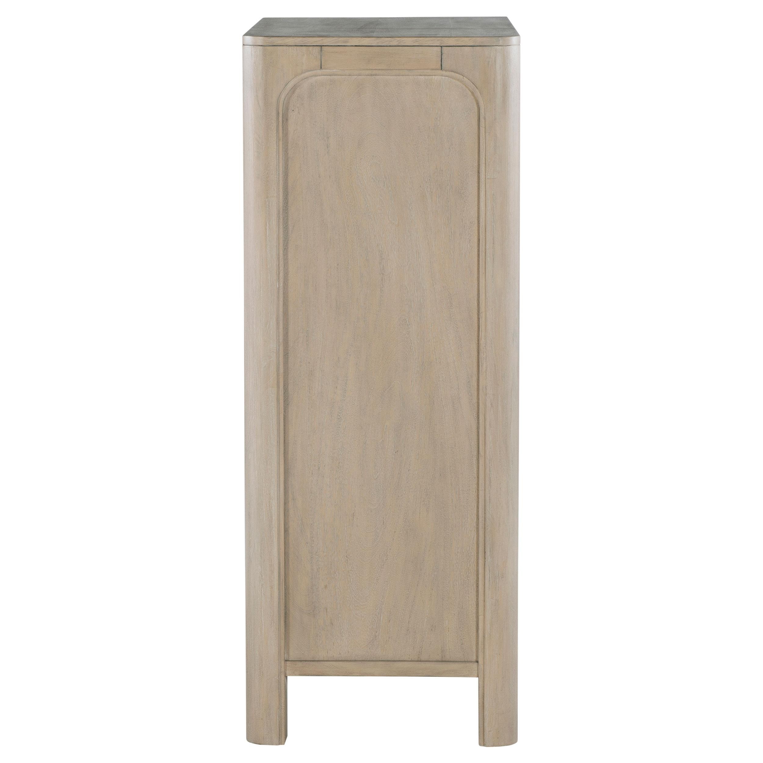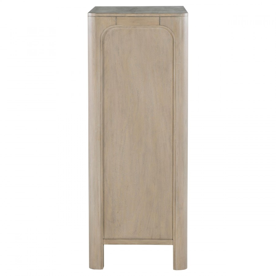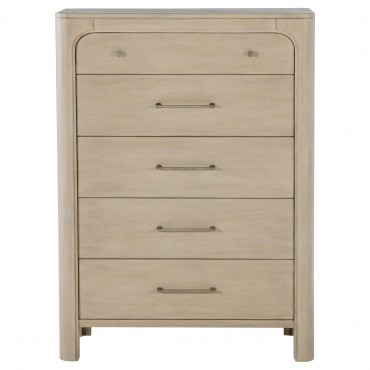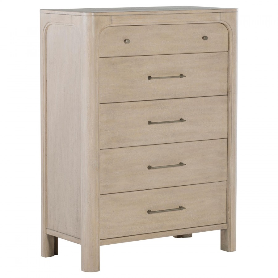 Gracefully composed with rounded edges and sculptural form, this five-drawer chest evokes a quiet sophistication. Its tall silhouette offers a sense of order, while sculpted corners and subtle detailing bring soft elegance to the bedroom. A felt-lined top drawer and hidden compartment add thoughtful layers of function. Crafted with care and presence, it offers both beauty and intrigue in equal measure.