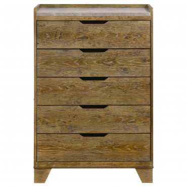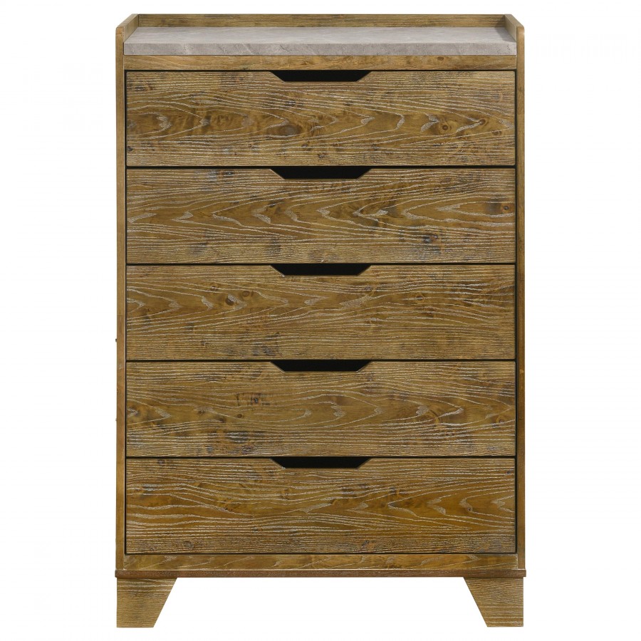Rustic charm meets modern refinement in this five-drawer chest of drawers, where natural textures and contemporary lines come together in perfect balance. The embossed oak grain surface is finished in a warm medium oak tone that highlights the richness of the solid rubberwood construction. A faux marble melamine top adds a touch of elegance, while the sculpted finger pulls and heavy-duty glides ensure smooth, quiet function with every use.