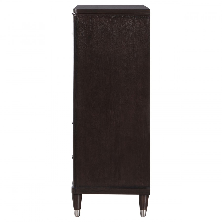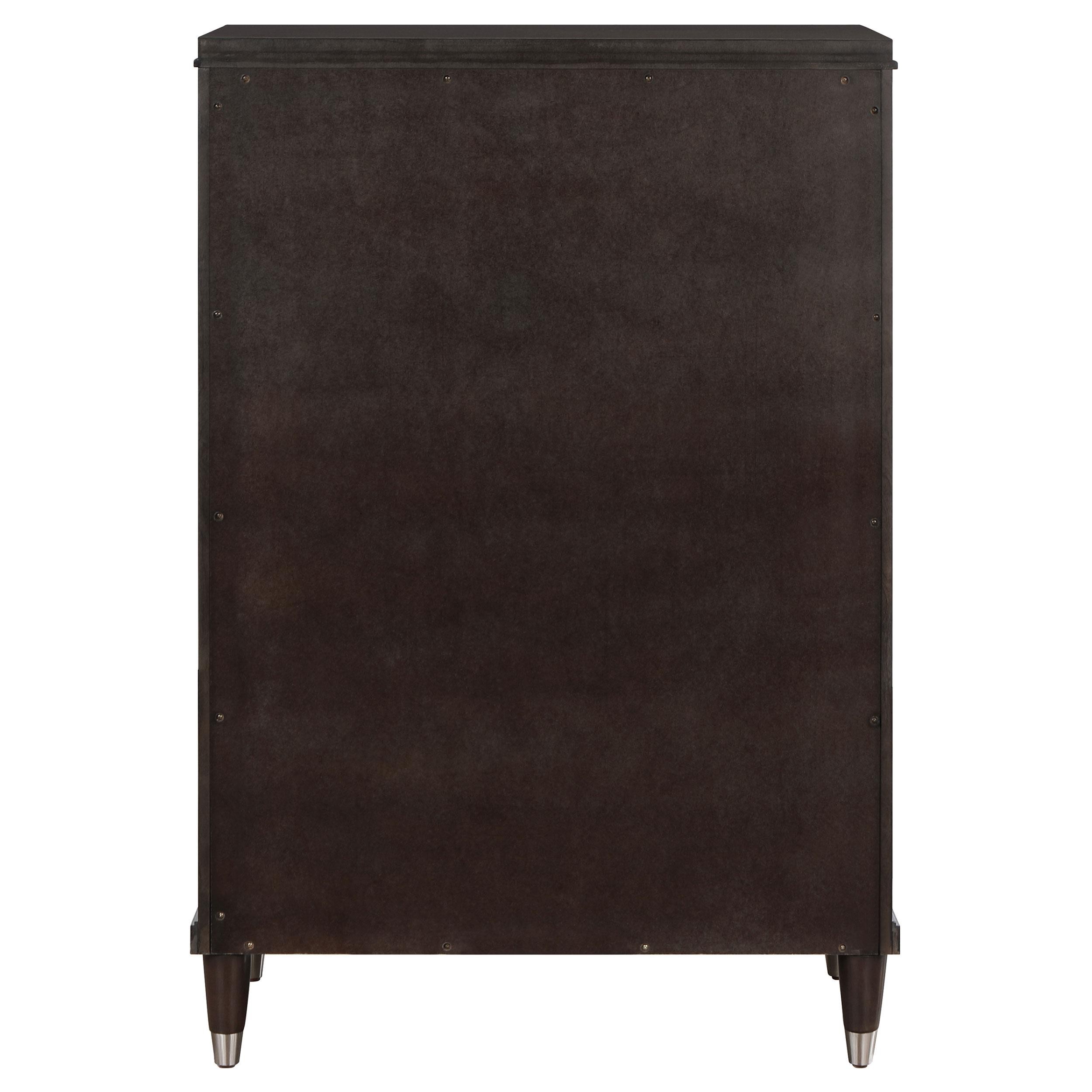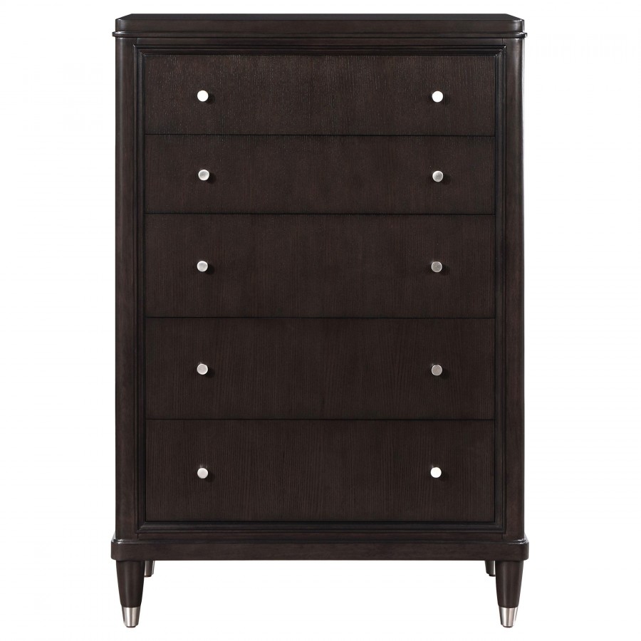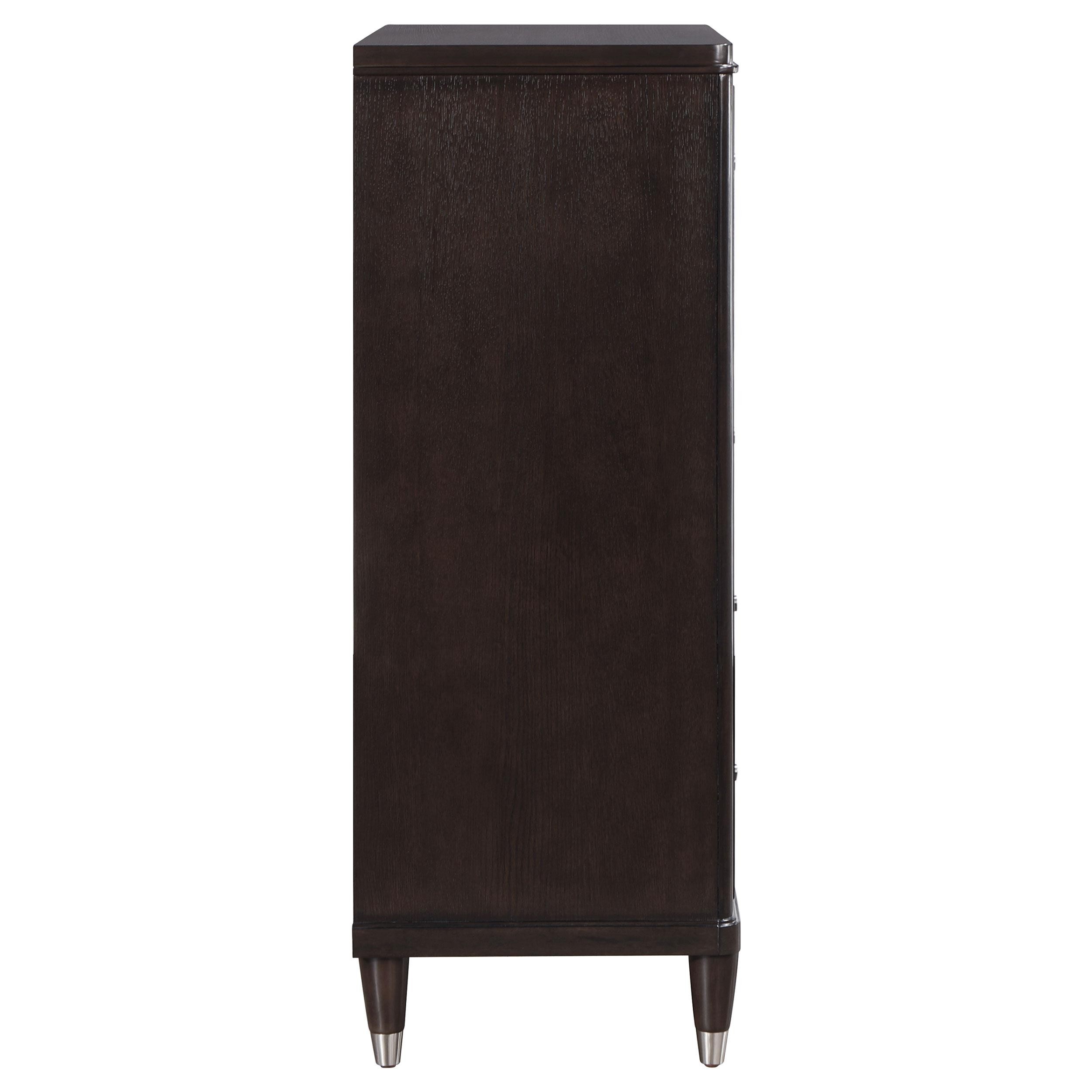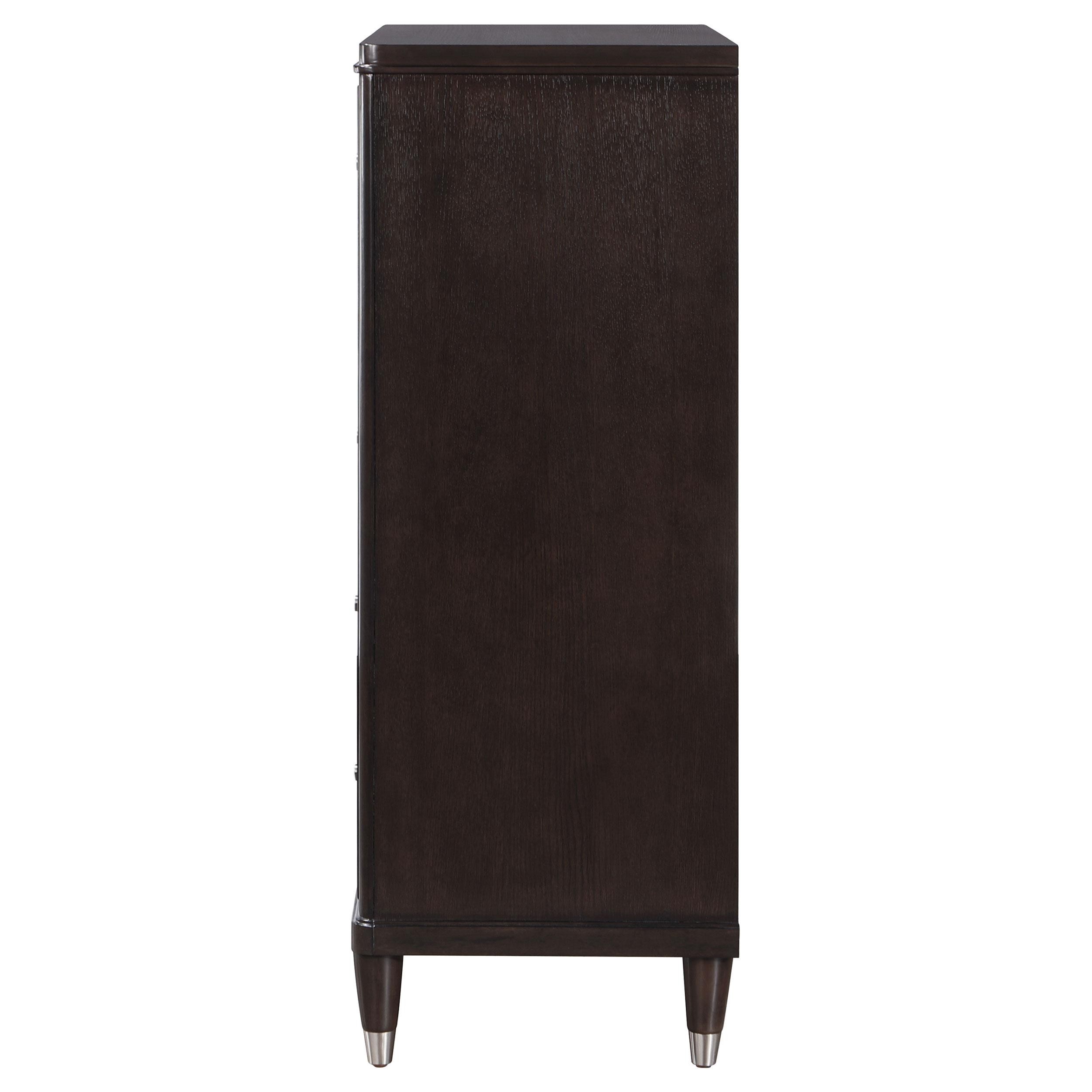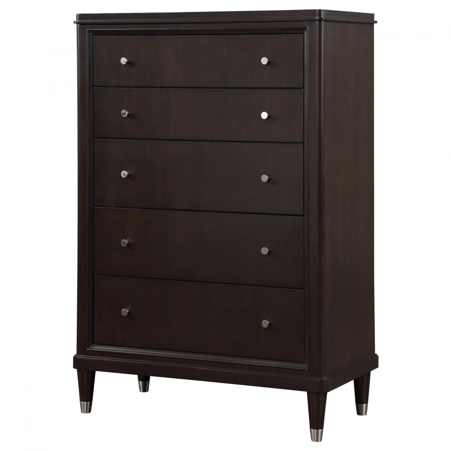 Gleaming knobs and foot caps add contrast and character to a modern five-drawer chest. Its deep brown finish is sleek and refined, perfect for a stylish bedroom with sophisticated presence. Its five drawers offer abundant storage. The top drawer includes felt lining and the bottom drawer is lined in cedar for additional protection for delicate items like jewelry and seasonal sweaters. The top of the chest is perfect for decor, offering a spot for a personal touch in your bedroom.
