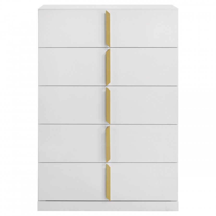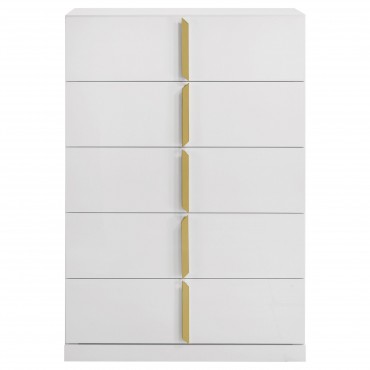 Inspired by Italian contemporary design, this five-drawer chest of drawers blends sculptural elegance with lasting performance. The white high gloss finish is laminated in PET, a high-performance thermoplastic known for its scratch resistance, moisture resistance, and long-term durability. Vertically mounted polished gold pulls add a bold accent, while five spacious drawers provide stylish storage for the modern bedroom.