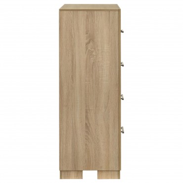 A graceful blend of form and function, this four-drawer chest brings refined charm to any bedroom. Its clean silhouette is softened by a warm light oak finish, while antique nickel hardware adds a touch of elegance. Thoughtfully crafted from engineered wood with a durable laminate veneer, it balances beauty with resilience. Smooth-gliding drawers feature English dovetail joinery, offering a timeless solution for storing clothing and daily essentials.