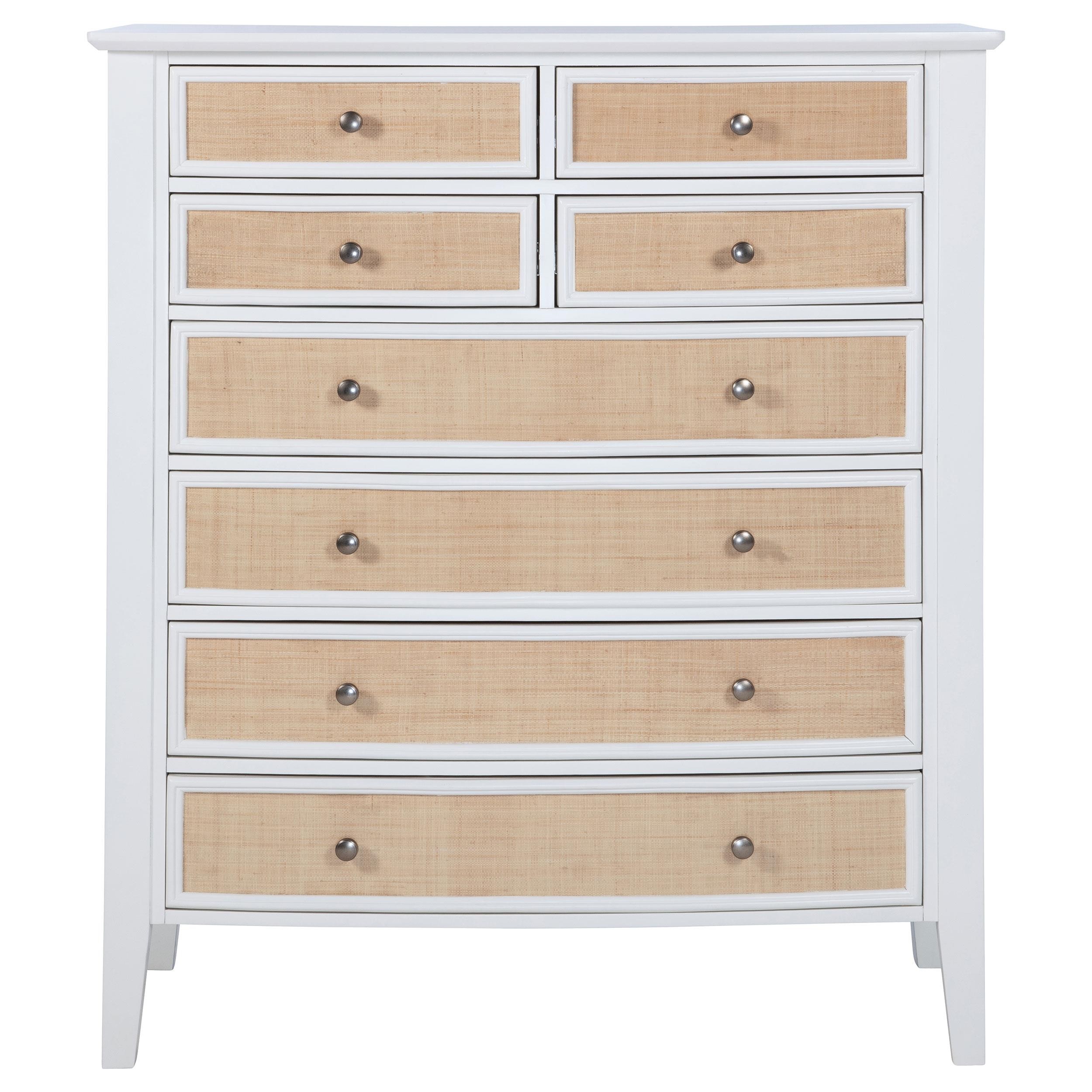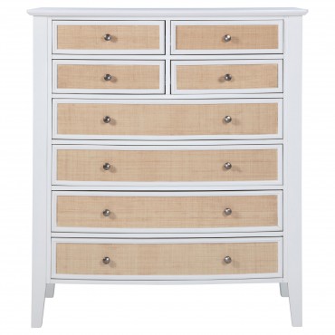 Create ample storage in your stylish bedroom with a modern eight-drawer chest. Its coastal style is established with a cool white finish paired with natural rattan finish accents on its drawer fronts, offering compelling contrast and texture. Eight drawers include four small and four large, with black felt lining in the top drawers to add a touch of luxury and protection. The case features a gently bowed front that adds inviting energy to its silhouette. A roomy top is ideal for decor and personal effects, perfect for framed photos and a jewelry box.