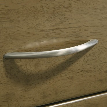 This five-drawer chest provides ample storage space while maintaining a sleek, contemporary aesthetic. The nutmeg wood finish offers a rich and inviting feel, while the rounded corners soften the design for a modern look. Each drawer is fitted with metal extension glides, ensuring smooth operation and easy access. The minimalist matte nickel hardware adds a refined touch to the chest's clean lines. Made from solid rubberwood, this chest combines practicality with modern design for a stylish and functional addition to your bedroom.
