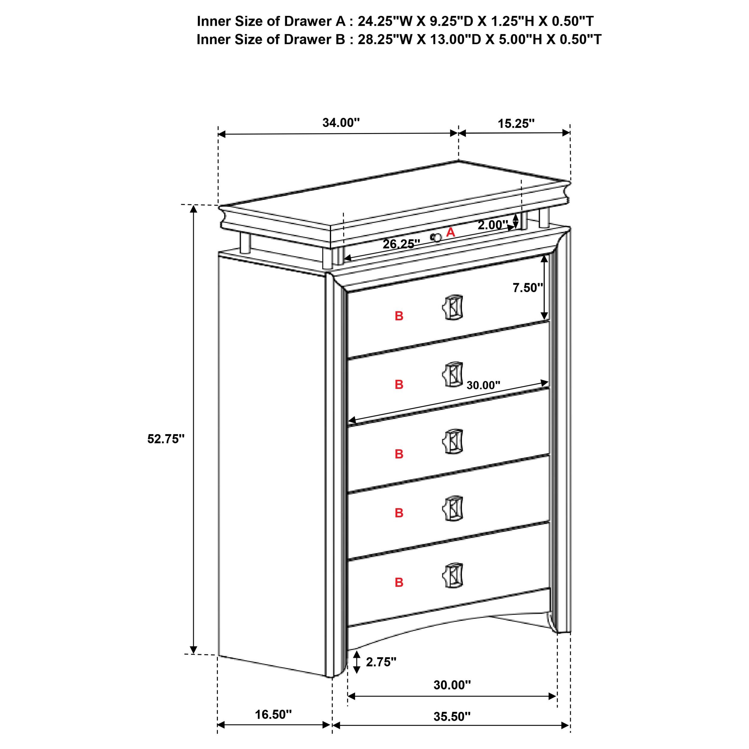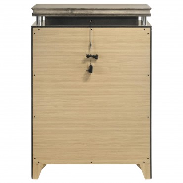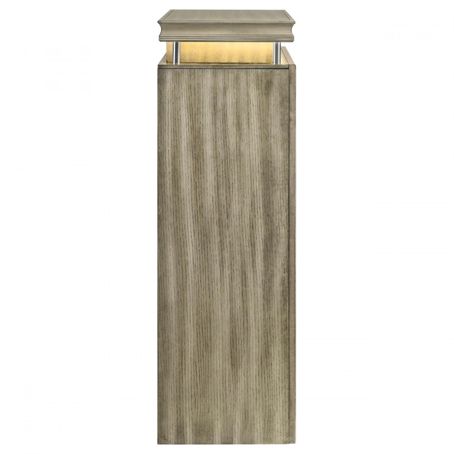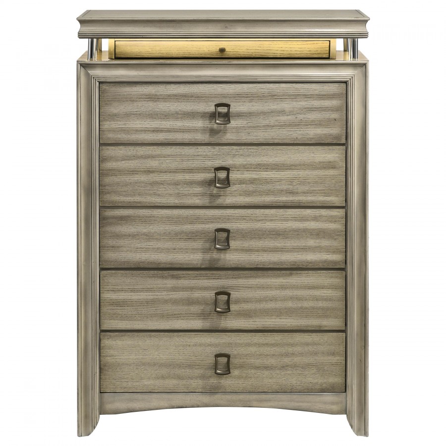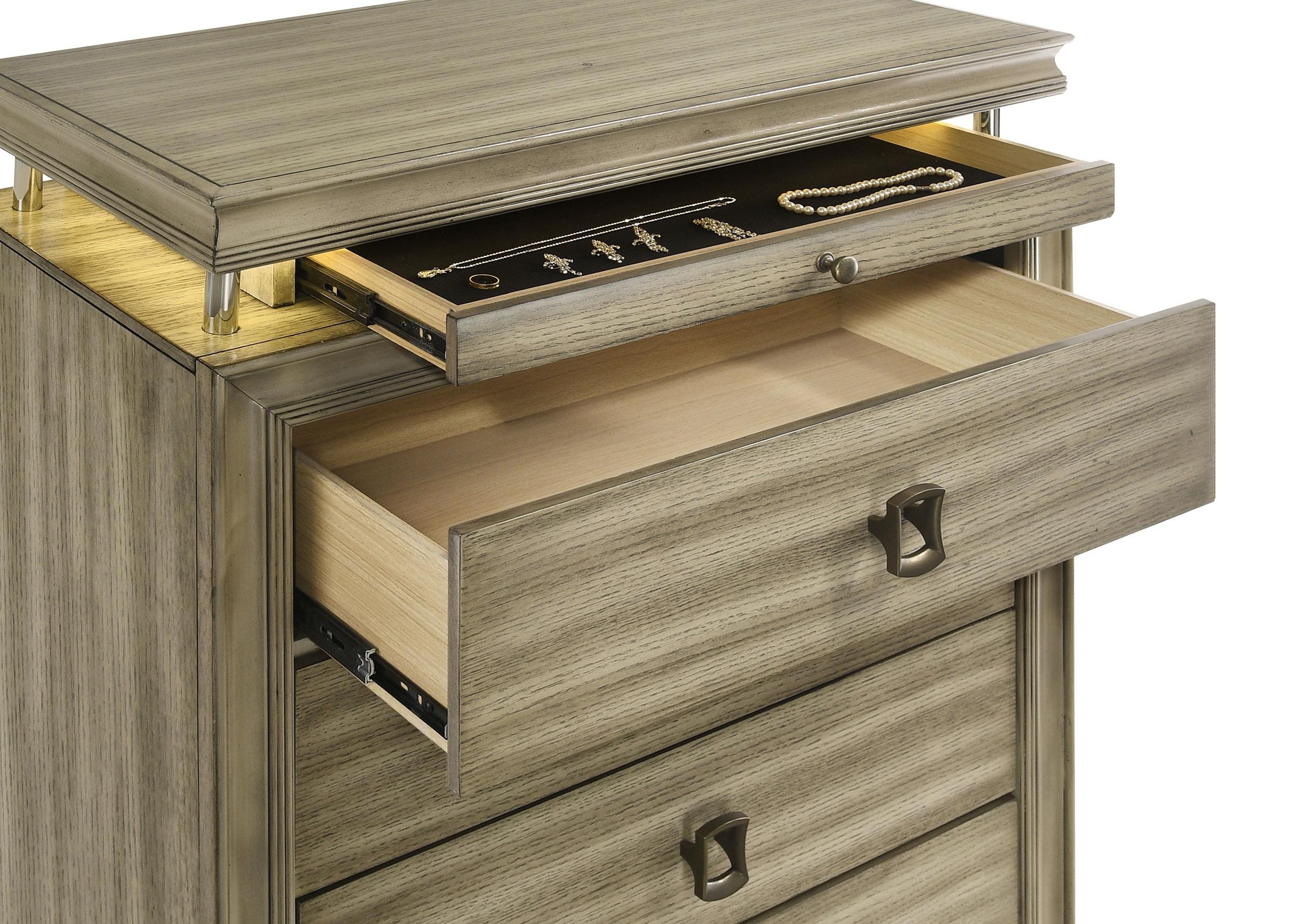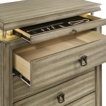 Expand storage and style in your bedroom with a modern six-drawer chest. Its compact footprint offers ample storage, complete with five large drawers for clothing and linens in its base. The top of the chest is raised, with a recessed accessory drawer complete with felt lining for added protection for delicates. A built-in LED light is operated with a touch switch on top of the chest and offers warm ambient illumination in your bedroom. The chest is complete with a neutral rustic beige finish to blend into surrounding decor and includes charming hardware for a stylish finishing touch.