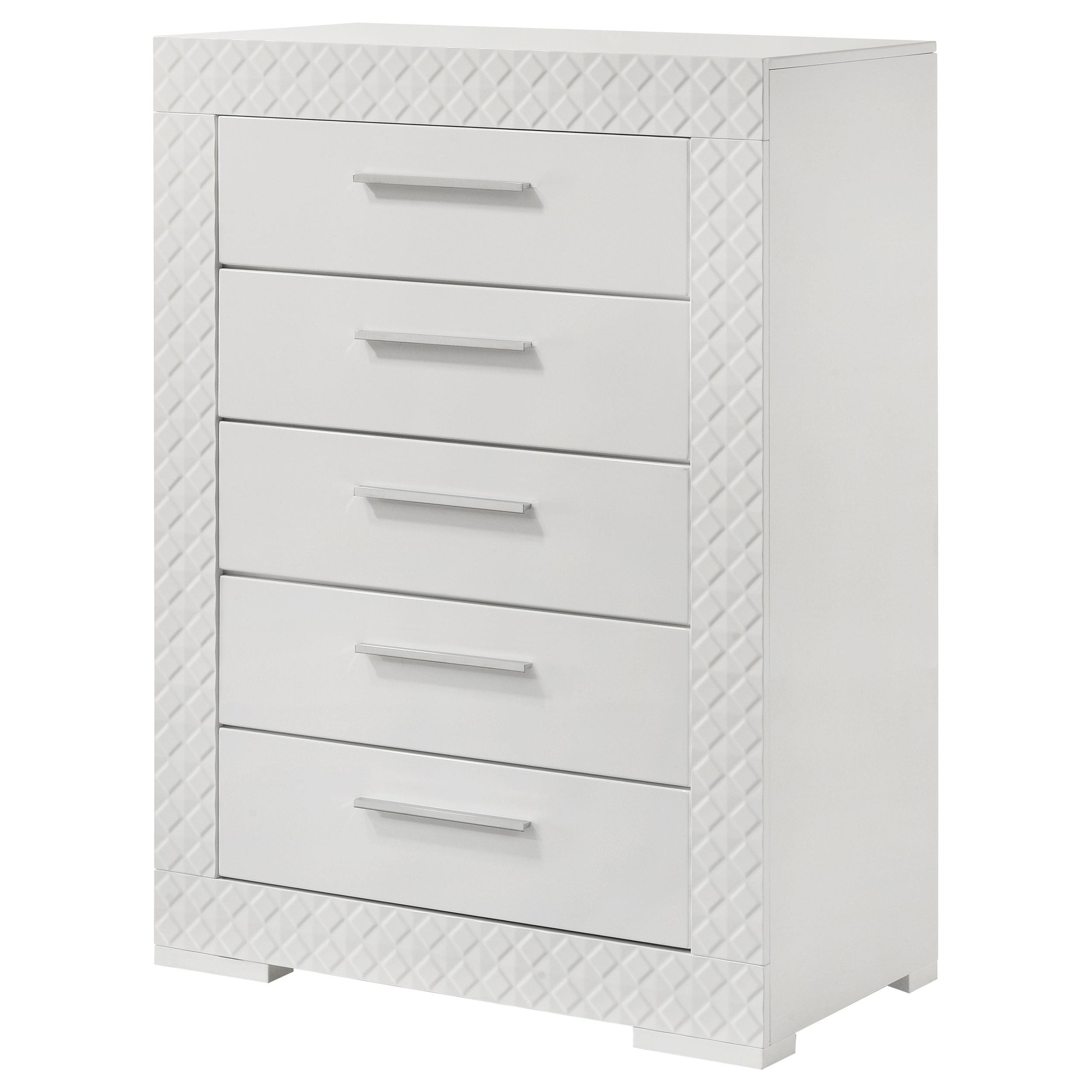 Organize your wardrobe in style with this contemporary chest. The high gloss finish and 3-dimensional diamond tile emboss provide a chic, modern look that enhances any bedroom decor. Five spacious drawers offer ample storage for clothing and linens, each with felt lining in the top drawers to protect your delicate items. The chest is built with robust materials and Pin construction joinery, ensuring durability and smooth functionality. This piece is both practical and stylish, perfect for a modern home.