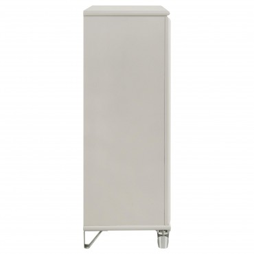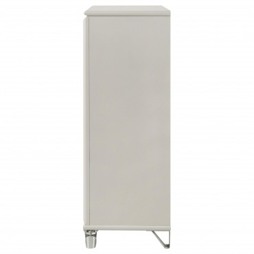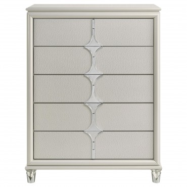 Discover elegance and functionality with this beautifully crafted chest, designed to complement your bedroom suite. The pearl white finish, highlighted by the unique diamond star drawer fronts and chrome metal pulls, exudes a contemporary charm. Acrylic feet with polished chrome caps add a touch of sophistication. Offering ample storage, this chest keeps your space organized while enhancing your room’s aesthetic. Experience the perfect blend of style and practicality with this exceptional piece.