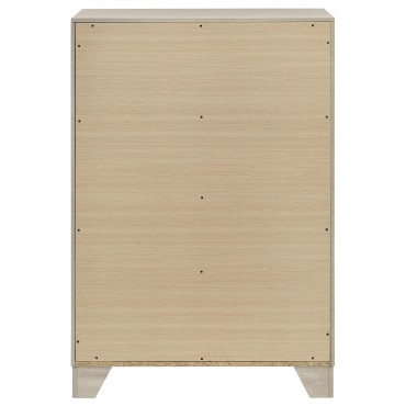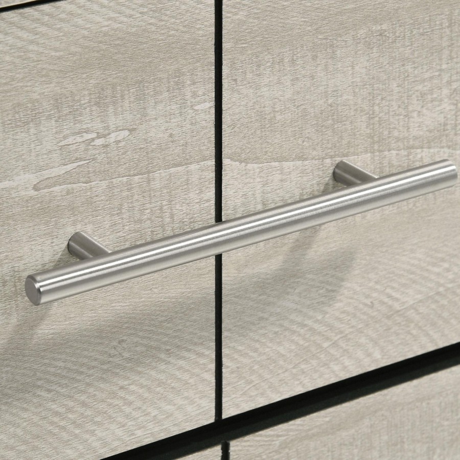 This four-drawer chest offers a stylish combination of rustic charm and modern design, making it a perfect storage solution for contemporary bedrooms. Finished in a rustic cream with rough-sawn, white-washed engineered paper veneer, it has a warm, textured appeal that’s both inviting and chic. The extra-wide polished nickel handles add a sleek, modern touch, creating a subtle contrast. Built with engineered wood, the chest features English dovetail joinery and Center metal glides for durability and smooth functionality, ensuring it meets both aesthetic and practical needs.