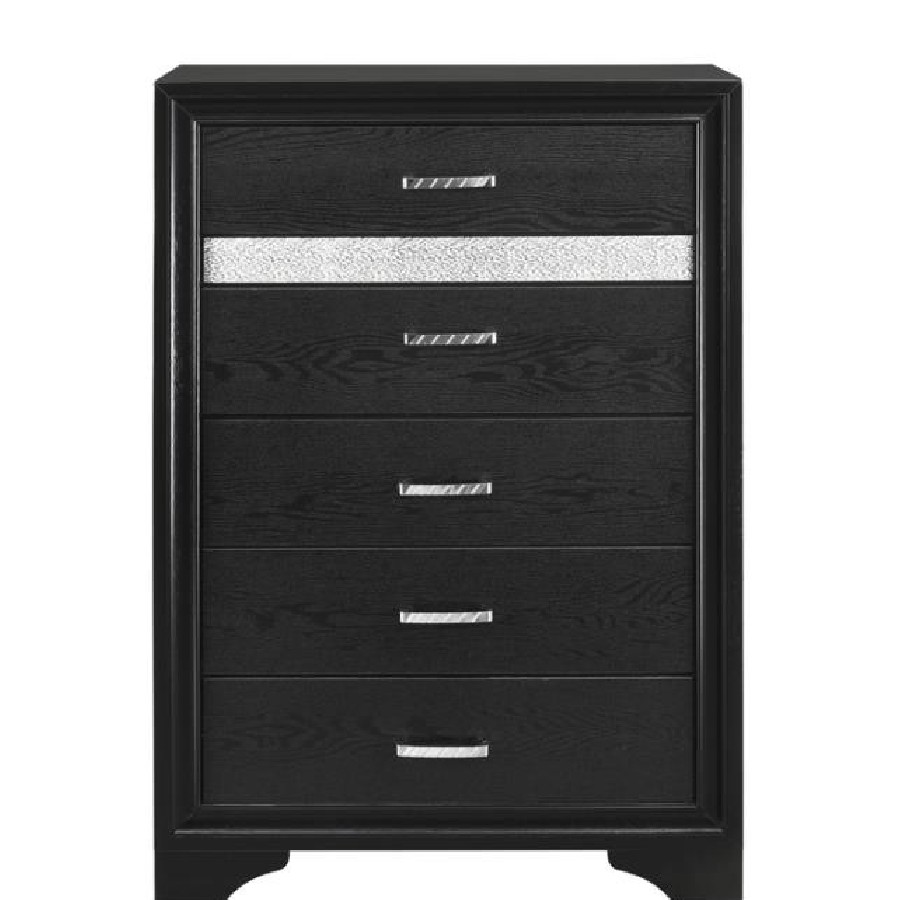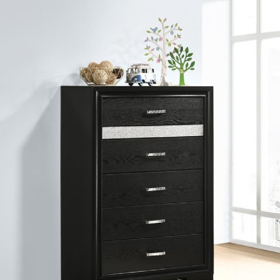 Add posh, upscale ambiance to your bedroom decor. This chic, stylish chest livens up a room with a dazzling touch of sparkle. With a hidden jewelry drawer built in, it keeps valuable items safe and secure. Its drawers are lined with felt for a luxurious hint of softness. Its six convenient drawers are built with metal extension glides for versatile ease of use.