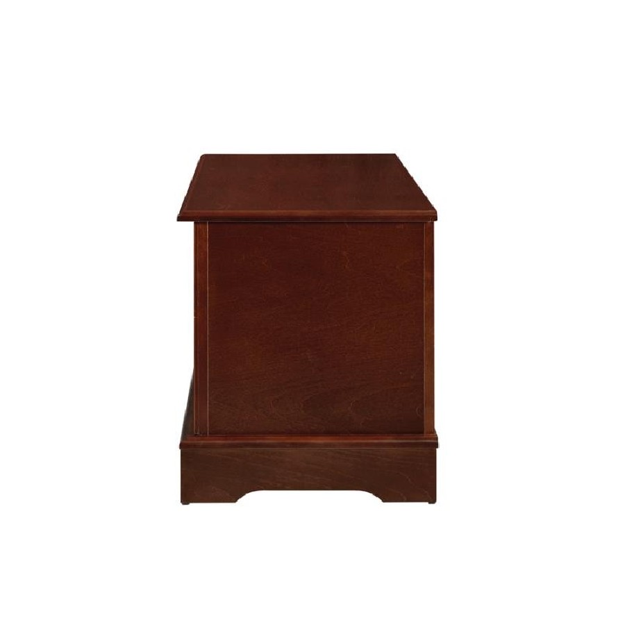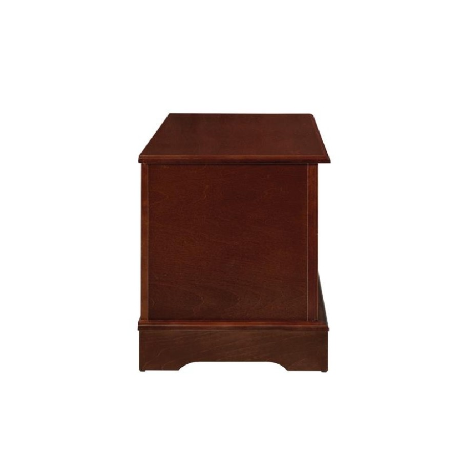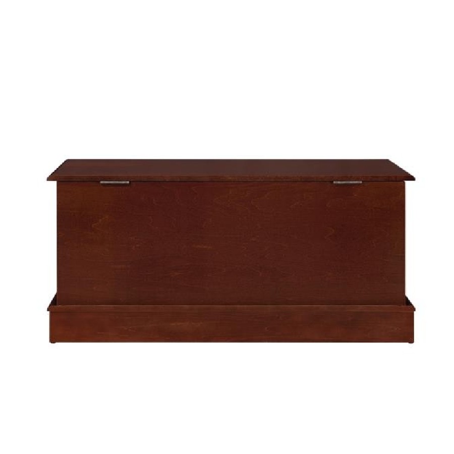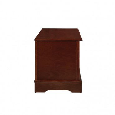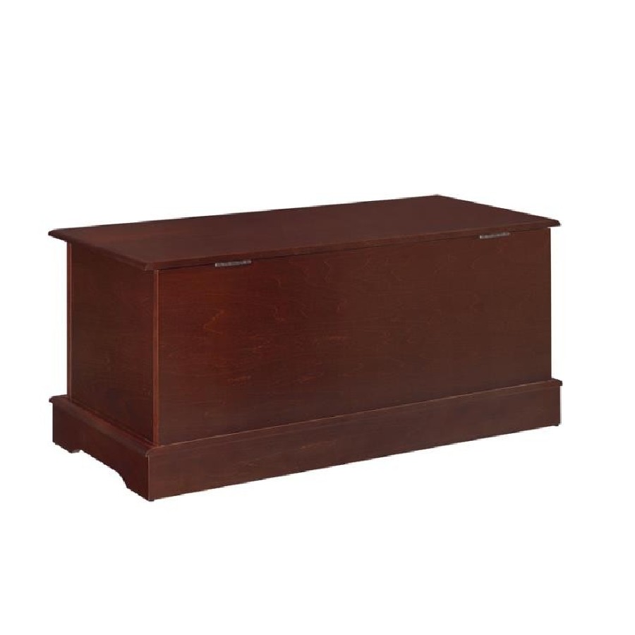 A wood storage chest is a necessary accoutrement to any home. This engineered wood chest has simple elegant lines and a sturdy demeanor. Roomy enough for a collection of seasonal bedding or family photo albums. If you're storing surprise gifts for an upcoming birthday or even for the holiday season, you'll be happy that the lid features a lock. Richly finished in warm brown.