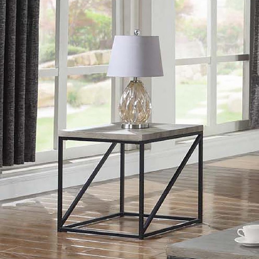Upgrade your living space with this contemporary end table, combining functionality and style. The engineered wood top features a scratch-resistant laminate veneer in a sonoma grey finish for a wood-like appearance and lasting durability. Supported by a black powder-coated metal frame, this side table provides stability and industrial charm. Compact and versatile, it fits effortlessly next to sofas, chairs, or beds, making it a practical addition to any room.