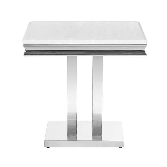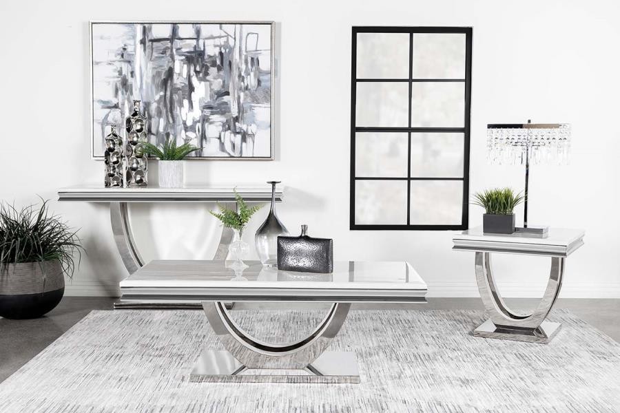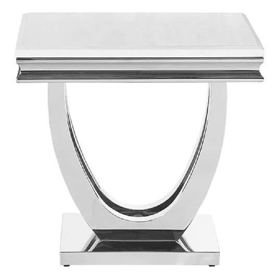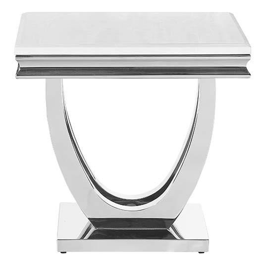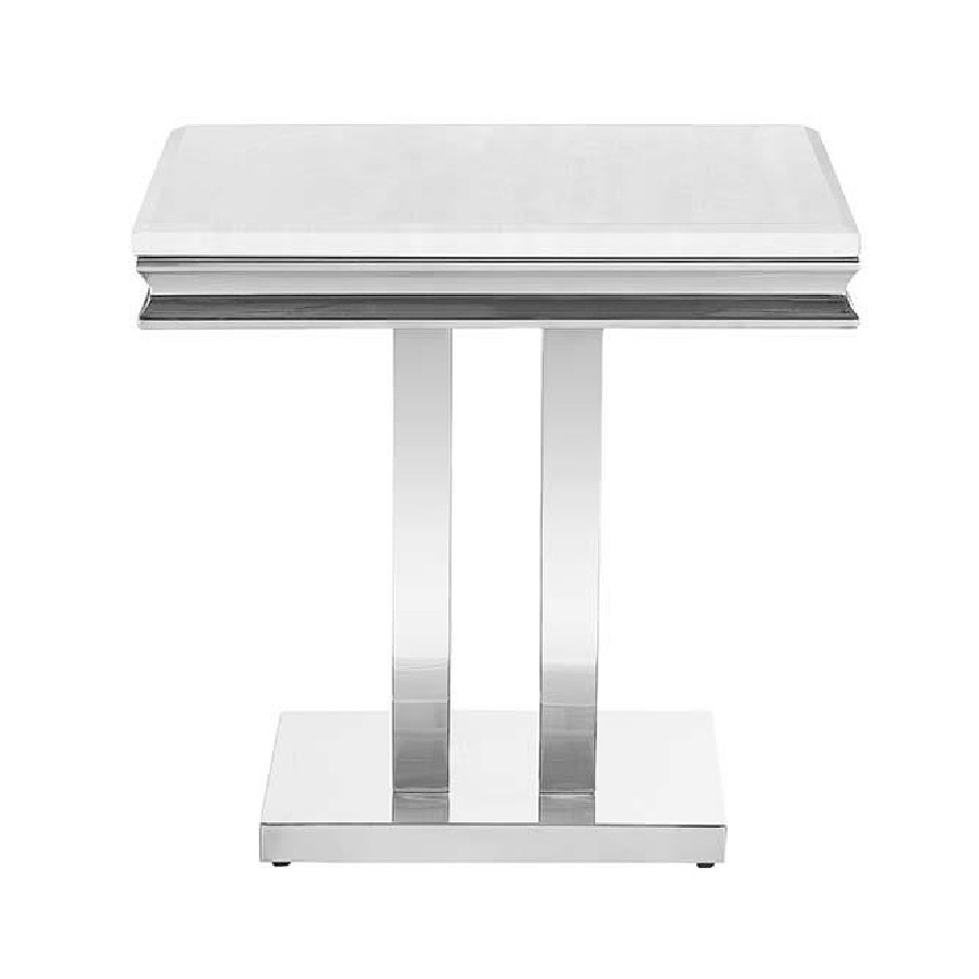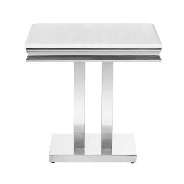 This end table combines modern glam and functional elegance with a sintered stone top featuring a marble-like appearance and beveled edges. Its sweeping demilune pedestal base in polished stainless steel provides stability while enhancing the sleek, contemporary aesthetic. Contoured molding adds an extra touch of refinement, making this ultra-modern piece a perfect addition to any sophisticated living space.