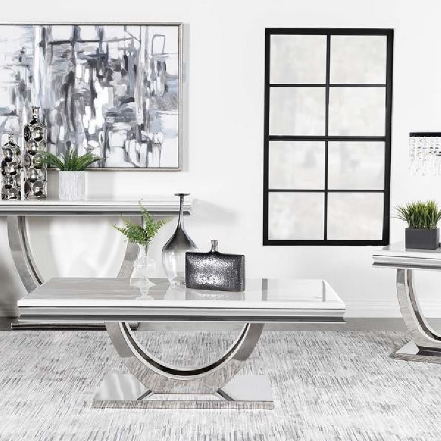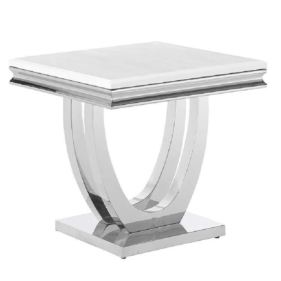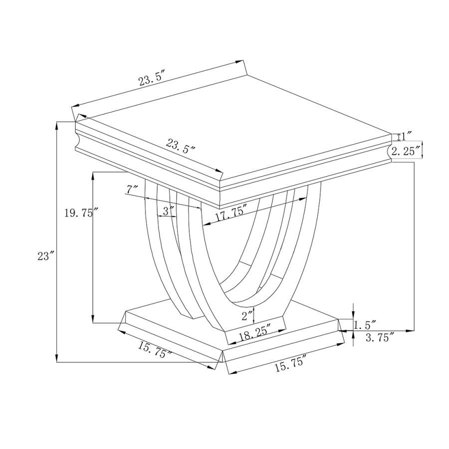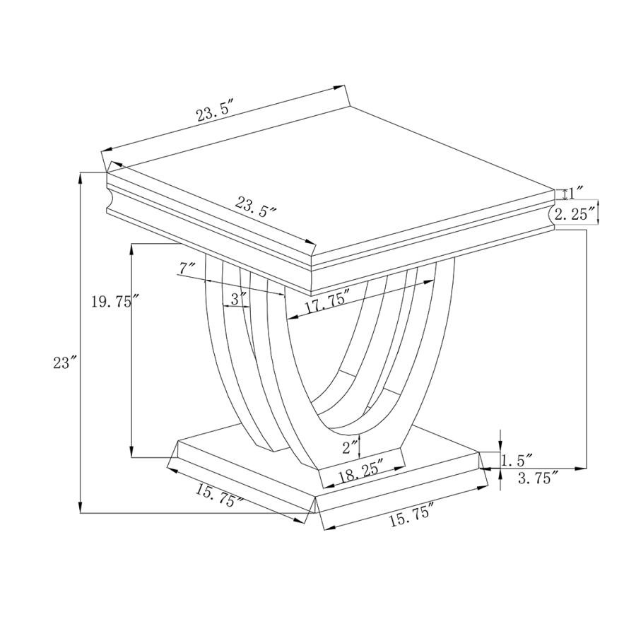 This end table combines modern glam and functional elegance with a sintered stone top featuring a marble-like appearance and beveled edges. Its sweeping demilune pedestal base in polished stainless steel provides stability while enhancing the sleek, contemporary aesthetic. Contoured molding adds an extra touch of refinement, making this ultra-modern piece a perfect addition to any sophisticated living space.