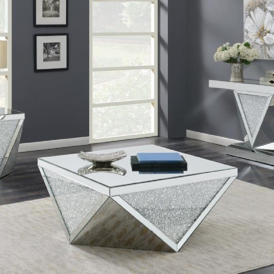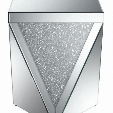 Dress up your decor with breathtaking, modern luxury. This mirrored end table combines a bold, diamond-shaped design with triangular panels of eye-catching, glittery material. The triangular mirrored surfaces create reflective beauty, while sparkling acrylic crystal inlays enhance its opulent style. Exquisitely designed, this contemporary end table makes a bold statement in any modern living space, bringing a touch of glam and luxurious sophistication.