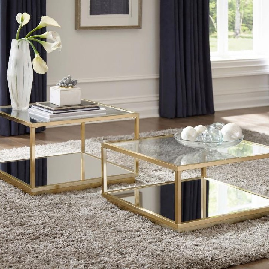 Add this contemporary two-piece occasional table set to your home. Set features both a large and small table that can stand alone or fit beside each other. A rose brass finish frame adds glam and luster to the look. The square table top features crisp, clean lines and sharp angles that define its modern sensibilities. It's an ideal accent piece set that adds a touch of panache to any contemporary living room or den.