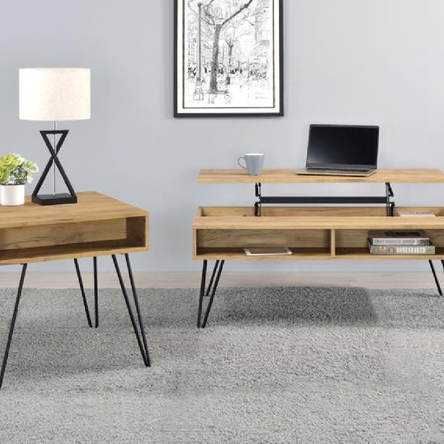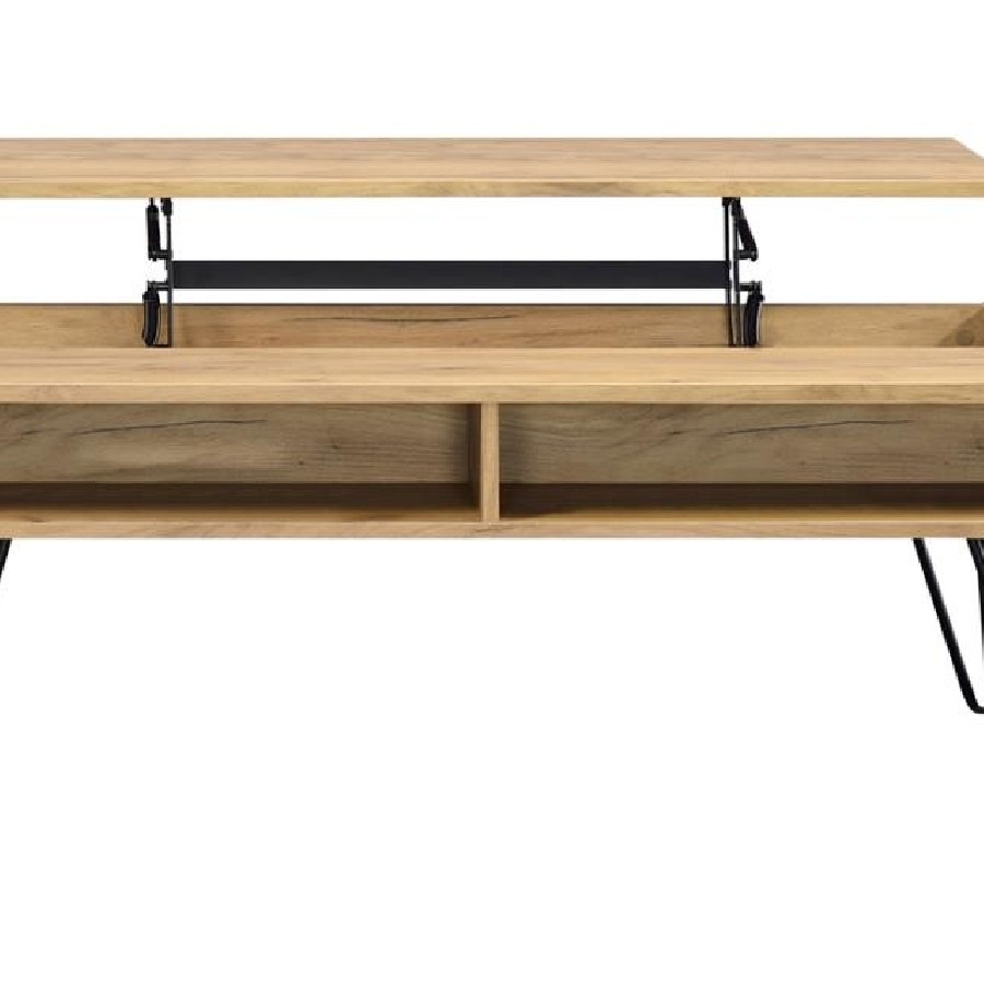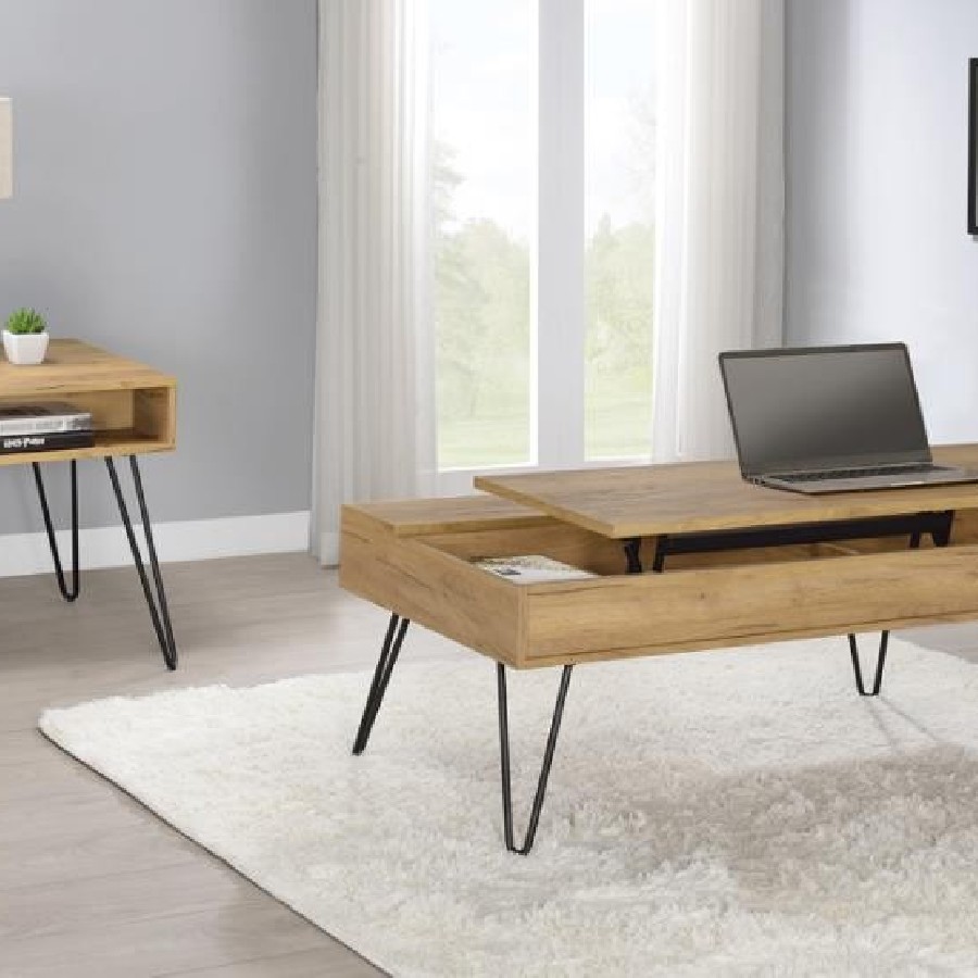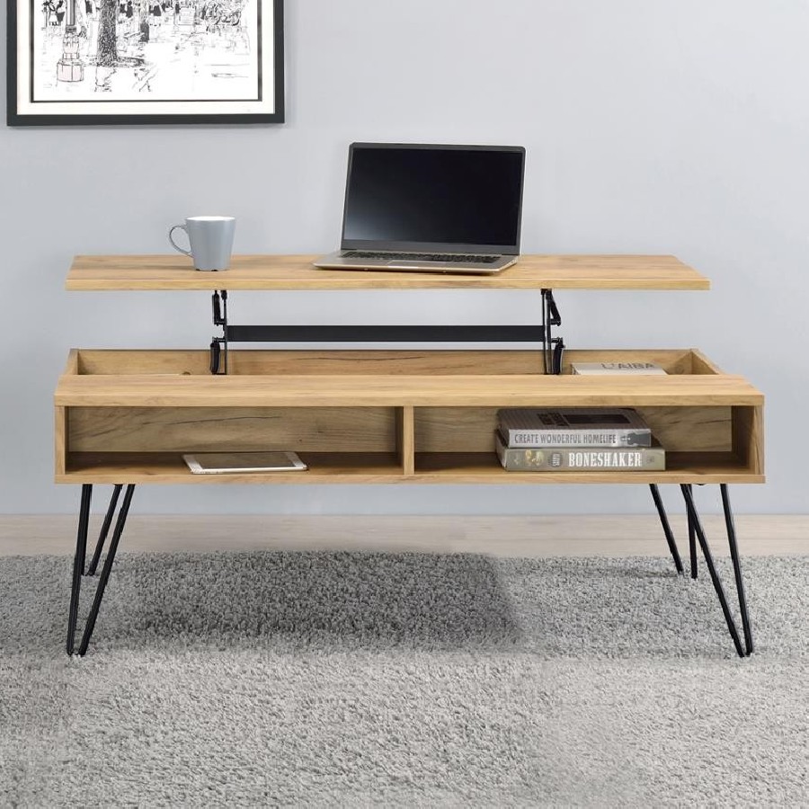 This rectangular coffee table delivers both style and functionality. The lift-top design provides hidden storage, making it perfect for decluttering living spaces. Crafted from engineered wood with a scratch-resistant, eco-friendly laminate veneer in a golden oak finish, it is built to last. Black hairpin legs add a modern industrial vibe, while the spacious tabletop offers ample space for entertaining or everyday needs.