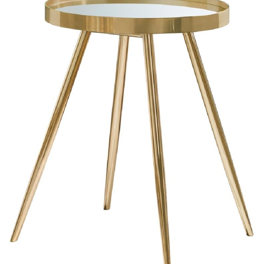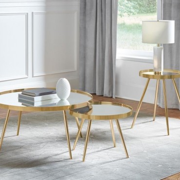 This elegant end table features a round top with a recessed mirrored surface, providing a sleek and reflective finish. The sturdy metal frame is finished in gold electroplated metal, enhancing its modern, polished look. Its four angled legs offer stability while creating a dynamic visual profile. Ideal for use in living rooms, bedrooms, or office spaces, this accent table combines style and function, making it a standout addition to any interior.