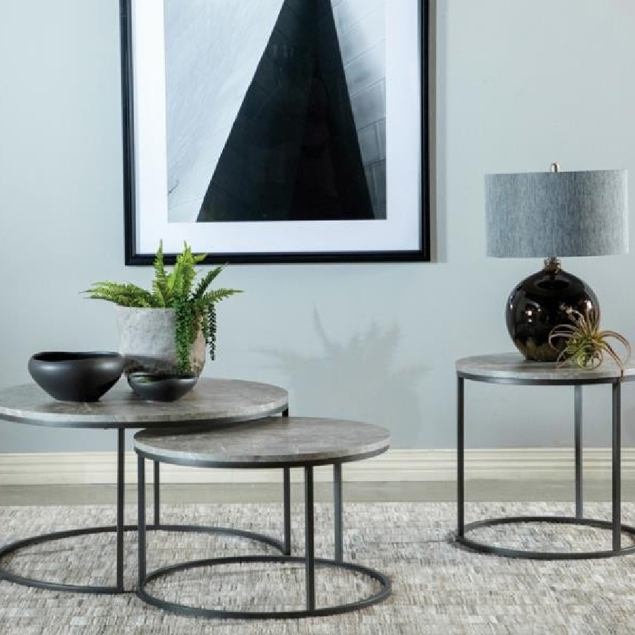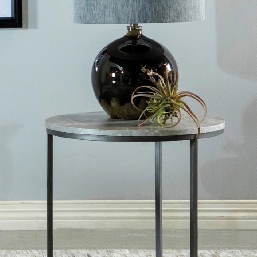 This sleek end table combines minimalist design with modern materials to create a striking accent piece. Featuring a round faux marble tabletop in grey, the piece is complemented by a sturdy gunmetal metal base. Its compact size makes it perfect for smaller spaces, while its refined design adds a touch of sophistication. Ideal for placement beside an armchair or sofa, this end table is a versatile choice for contemporary living rooms or bedrooms.