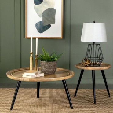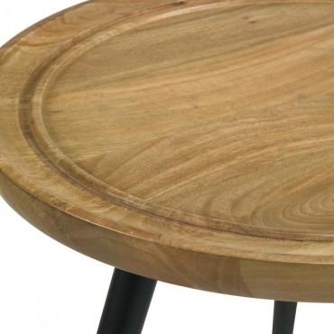 Infuse bohemian charm and mid-century style into your living space with this versatile end table. Crafted from solid mango wood, the round tabletop showcases natural wood grain patterns and a softly curved edge with carved detailing for added elegance. Its tripod-style iron base, finished in sleek black, offers stability and a modern contrast. Perfect for flanking a sofa or chair, this rustic accent side table blends timeless design with functionality, elevating your seating area with ease.