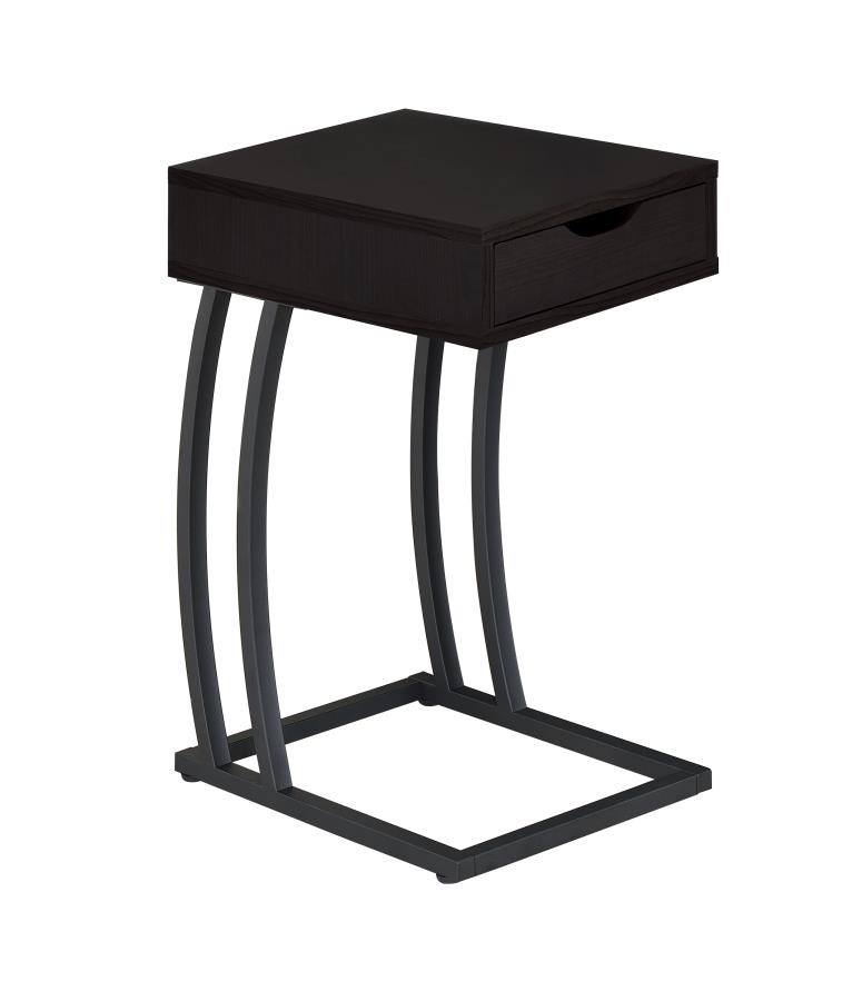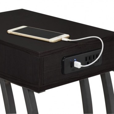 The perfect marriage of classic and modern design, this cappuccino accent table is full of contemporary upgrades. Great as an end, snack, or chairside table, the storage drawer works well for keeping clutter out of sight. A built-in power strip on the back contains two power outlets and two USB ports for easy charging and electronic use. Sleek and smooth, the rectangular top is complemented by thinly curved legs that connect in an open geometric base. The combination of the richly hued wooden details with gunmetal offers an industrial-inspired aura.