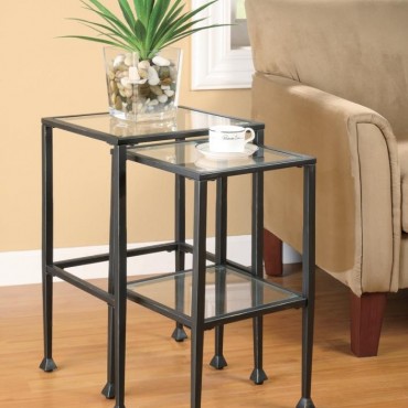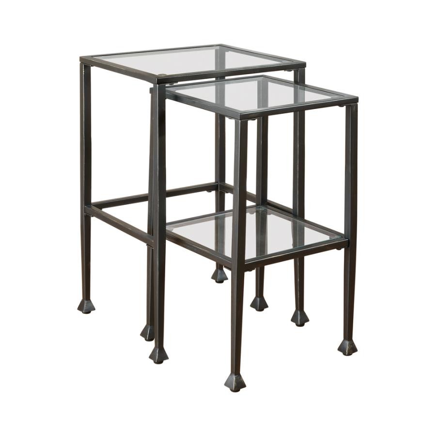 This two-piece nesting table set features sleek, modern design with clear tempered glass tops and shelves. The black powder-coated metal frame ensures durability and stability while enhancing the contemporary look of your living space. Perfect for compact areas, these tables can be conveniently nested when not in use and easily separated for versatile placement. Whether used as accent tables or side tables, their clean lines and minimalist design make them a practical and stylish addition to any home.