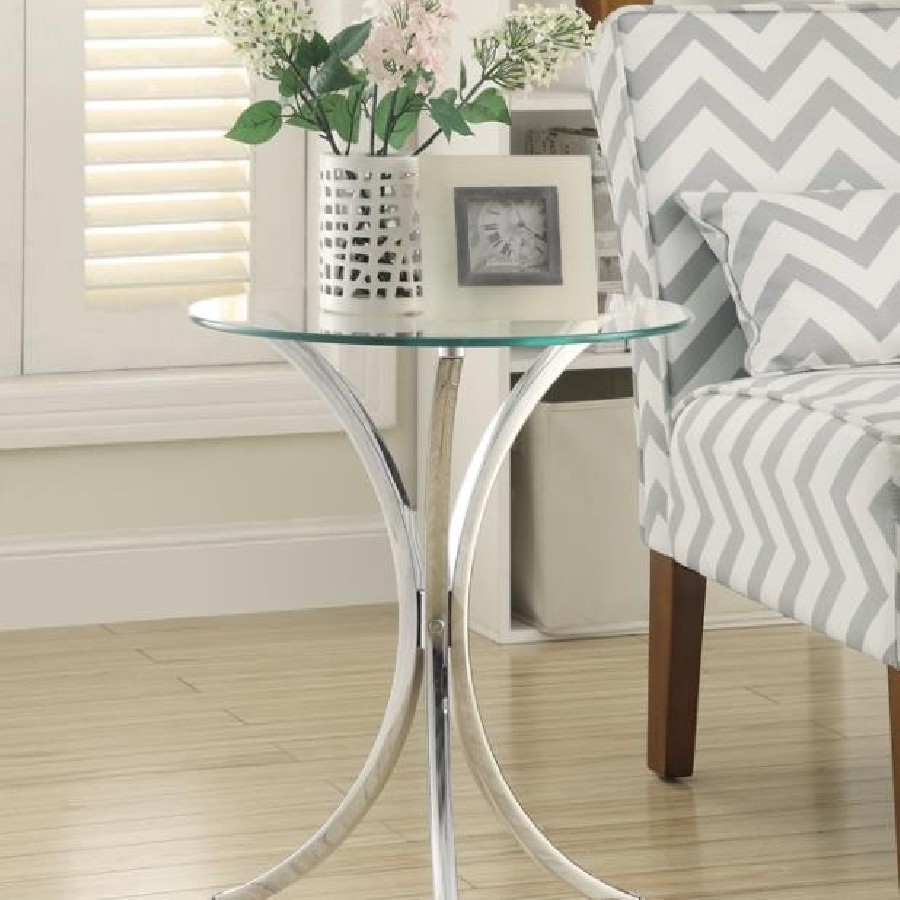 This contemporary side table combines sleek materials and modern design for a striking accent piece. Featuring a round, clear tempered glass top, it provides a durable and stylish surface for your essentials. The elegantly curved frame is crafted from heavy-gauge metal with a polished chrome finish, adding a reflective and sophisticated touch. Perfect as a side table or accent table, it blends seamlessly with modern and minimalist interiors.