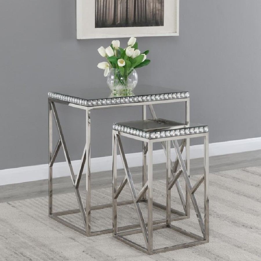 Show off your love for sparkle and shimmer this spectacular set of two silver nesting table. Your eyes will instantly be drawn to the clear crystal trim. Mirrored tabletops beautifully display your favorite decor. This nesting table set is supported on a stunning geometric shaped base made from metal. This gorgeous set will instantly add stylish flair to your space.