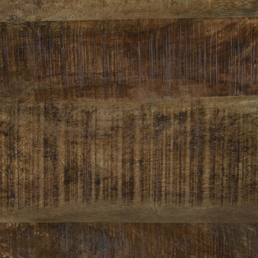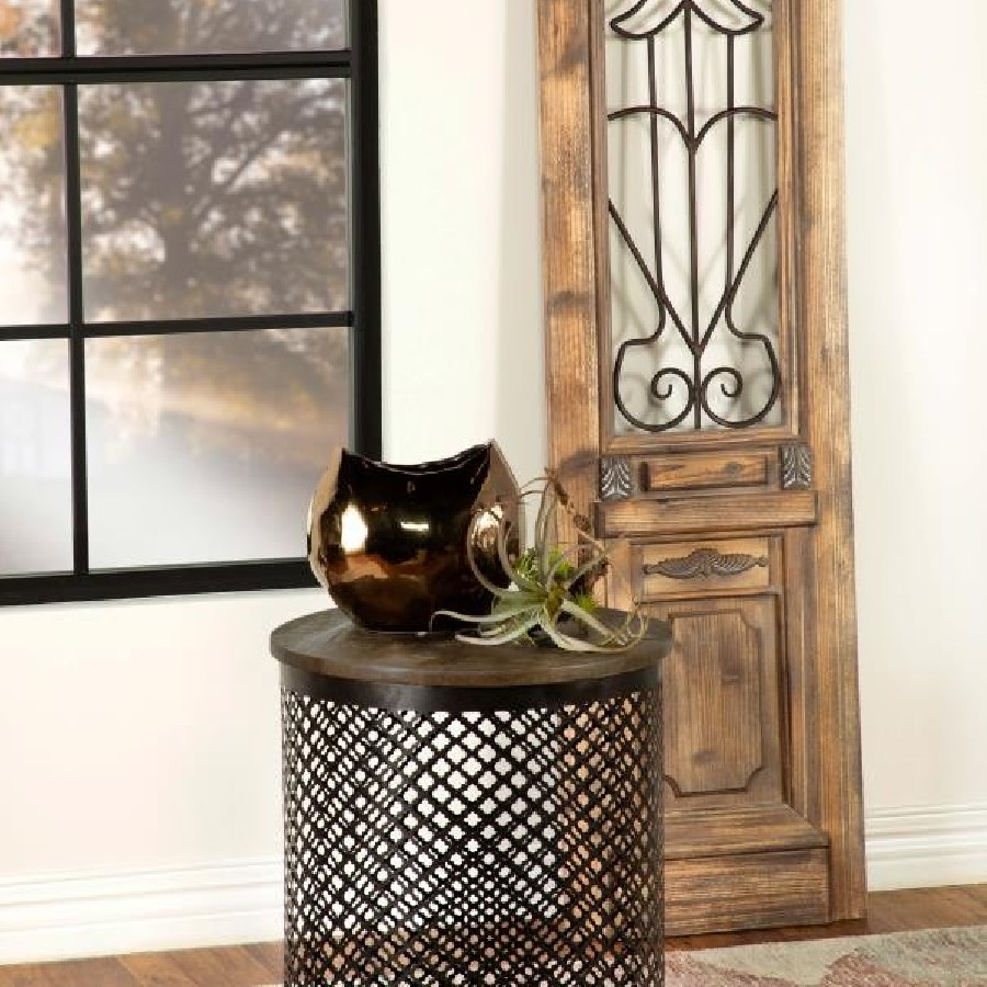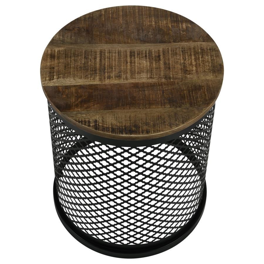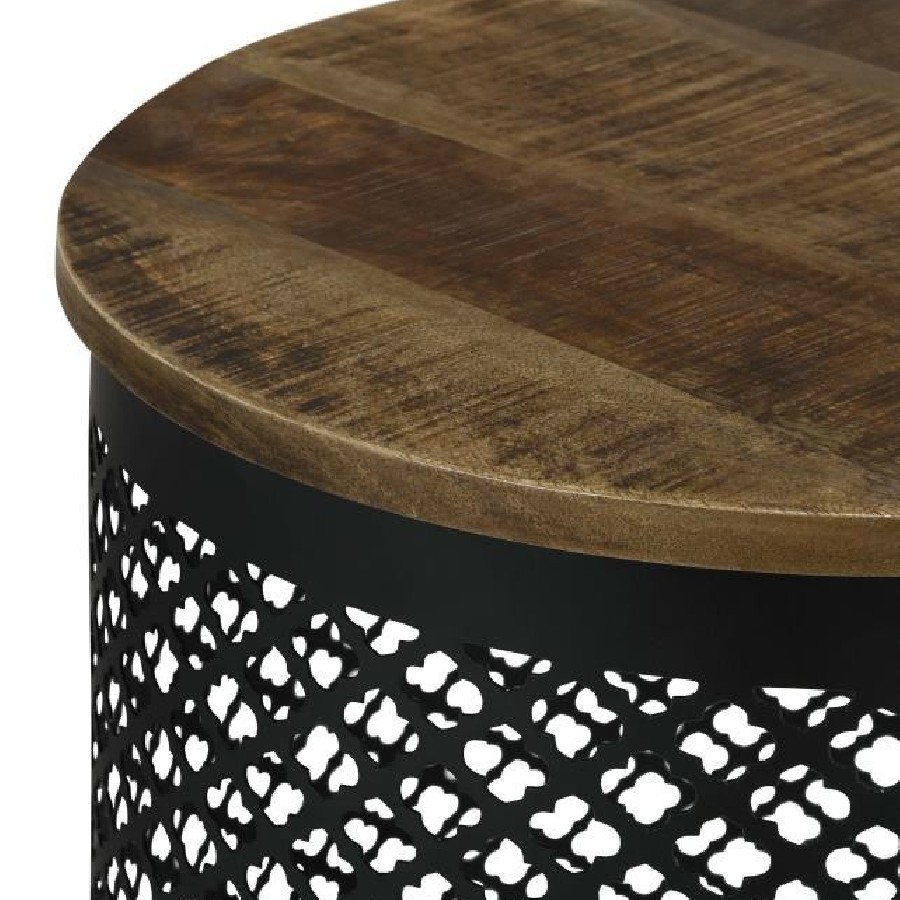 Blending rustic charm with industrial flair, this round accent table makes a striking addition to any space. The solid mango wood top, finished in a deep natural tone, highlights the organic wood grain for a warm, inviting look. The black iron drum base features an intricate perforated latticework design with a quatrefoil pattern, adding a layer of visual depth and texture. Whether used as a side table, nightstand, or decorative accent, this piece offers versatility and style to modern, industrial, or eclectic interiors.