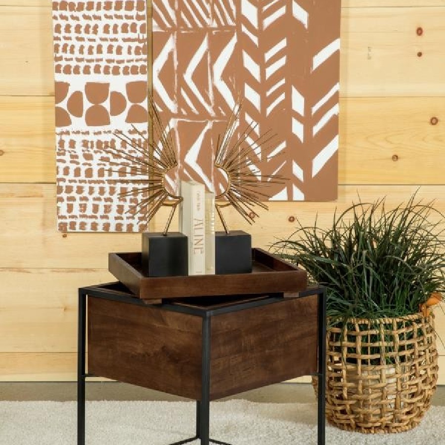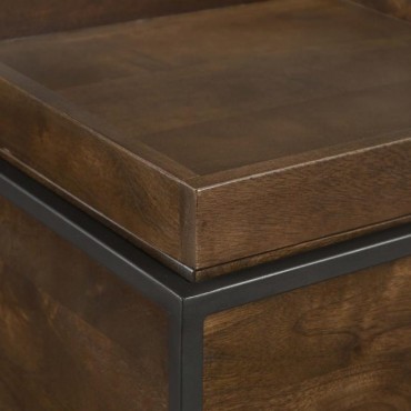 Versatile and perfect for compact homes and spaces, this accent table offers up plenty of interior storage. Designed with a minimalist aesthetic, this accent table features an open cube-inspired iron base with slim corner frame edges in a gunmetal finish. A hidden X-shape support floats the main wood feature, an eco-friendly mango wood storage area with a tray top, which offers a rustic charm with its dark brown finish. A removable tray top invites you to store throws, linens and more inside. A perfect addition for multipurpose spaces like guestroom home offices and other compact rooms.