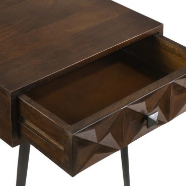 Showcase the striking woodgrains of this solid mango wood accent table, a stylish, eco-friendly addition to a sustainable home. Designed with flared tapered legs that offer an elegant look, this transitional accent table gives of mid-century vibes and an eclectic touch to a space. The single drawer offers ample space for essentials, keeping the tabletop tidy, and offers a lovely reverse carved motif with a star-like pattern across the front. The drawer also rests on wooden glides and features a single metal knob in a gunmetal finish, matching the finish of the retro-inspired legs. Place this accent table beside an accent chair as a place to keep a book or cup of coffee or allow it to double as a nightstand in compact bedrooms.