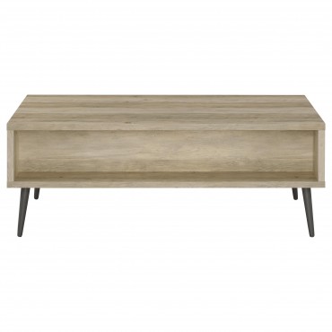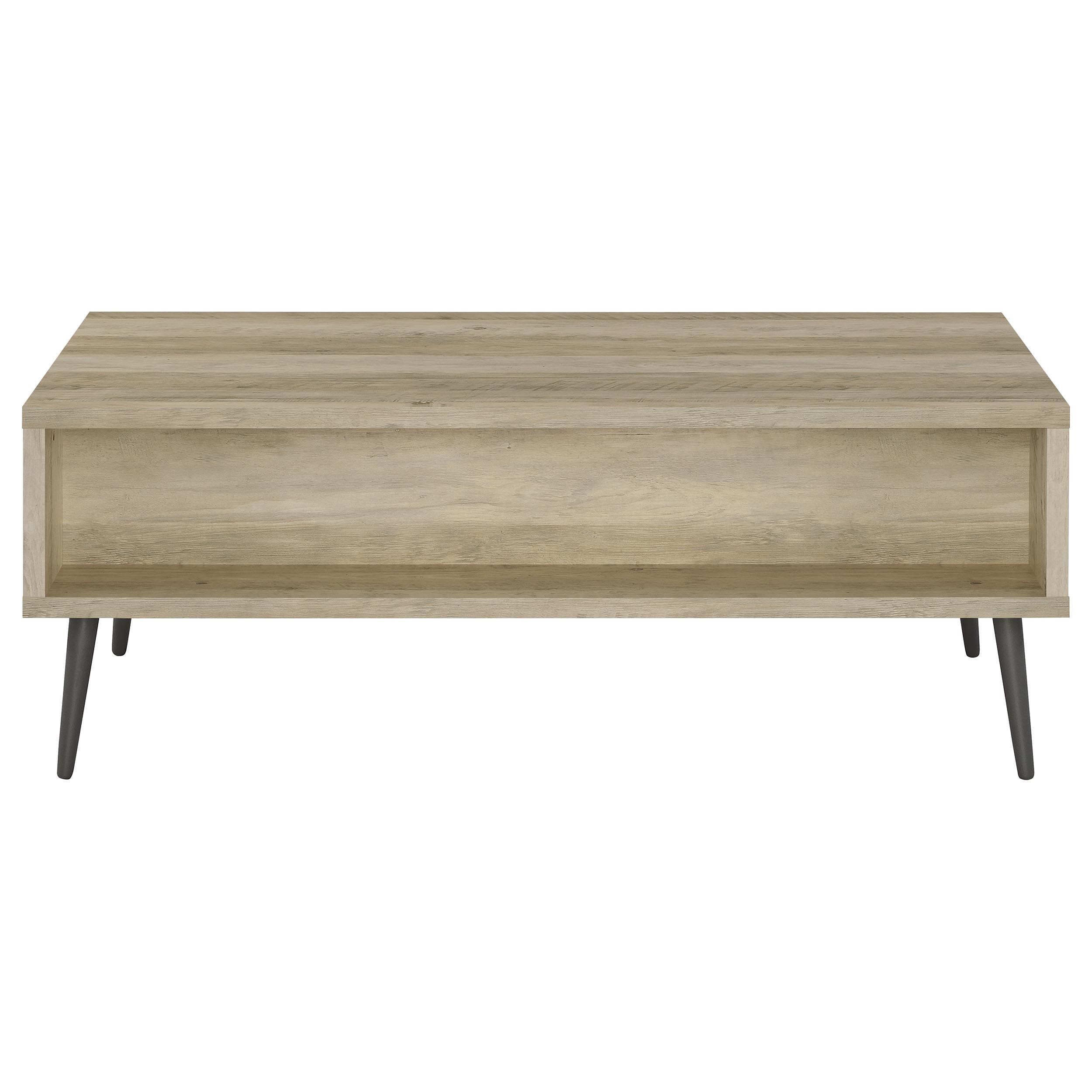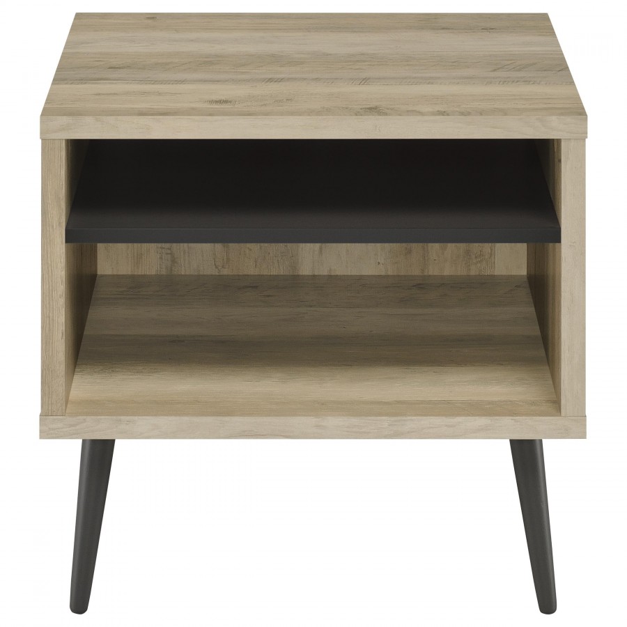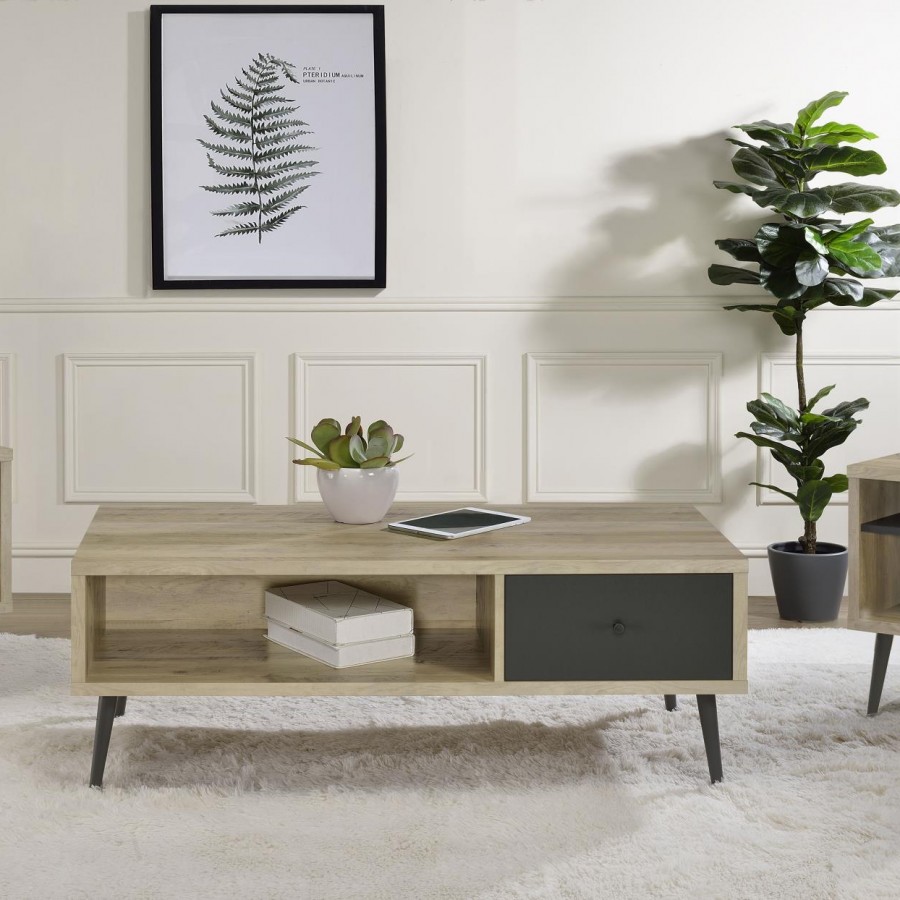 This coffee table set combines retro-inspired elements with modern practicality for a timeless living room update. The coffee table features a sleek rectangular silhouette, complete with a deep gray drawer front and open compartment for storing periodicals and books. The end table, with its square shape, offers a deep gray interior shelf to organize both tall and small items. Both tables are constructed from distressed pine finish engineered wood and rubberwood, with tapered rounded legs for a nod to retro style.