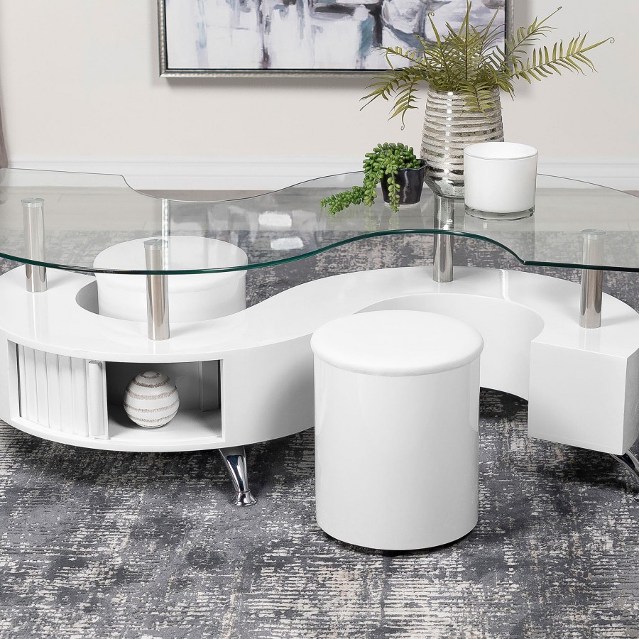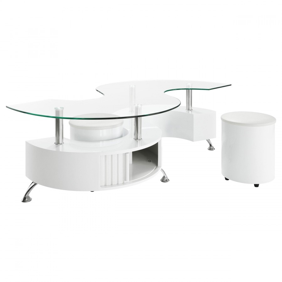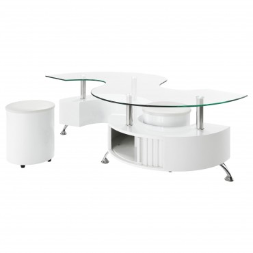 This coffee table features a serpentine shape with a clear tempered glass top and a durable engineered wood base. It includes two stools with padded seats, upholstered in faux leather for added comfort. A sliding door on both sides provides convenient storage space, while chrome accents enhance its sleek, modern design. This piece combines practicality with contemporary style, making it an ideal centerpiece for any living room.
