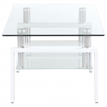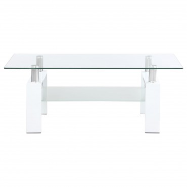 Enhance your living room with this sleek rectangular cocktail table, designed for style and functionality. It features a clear tempered glass top, complemented by a frosted tempered glass lower shelf for added storage or display. Supported by a sturdy metal frame, this coffee table combines durability with a modern aesthetic. Perfect for creating an open and airy look in your space, this table seamlessly blends contemporary design with practical utility.