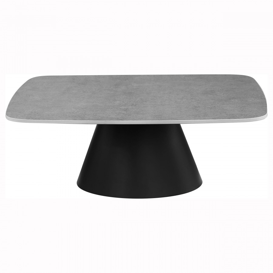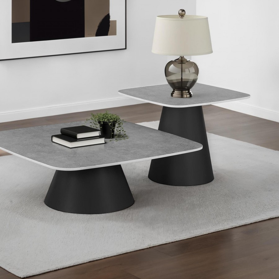 This two-piece coffee table set captures modern artistry through sculptural form and mixed materials. Each table features a square top with softly rounded corners in a concrete-look finish, perfectly balanced on matte black conical bases. The nesting design allows for flexible arrangement and compact storage. Constructed from durable engineered wood and sturdy metal, this cocktail table set makes a bold impression in any contemporary living space.