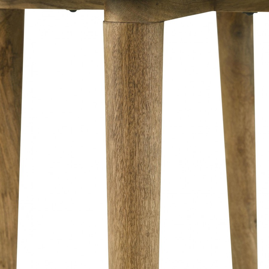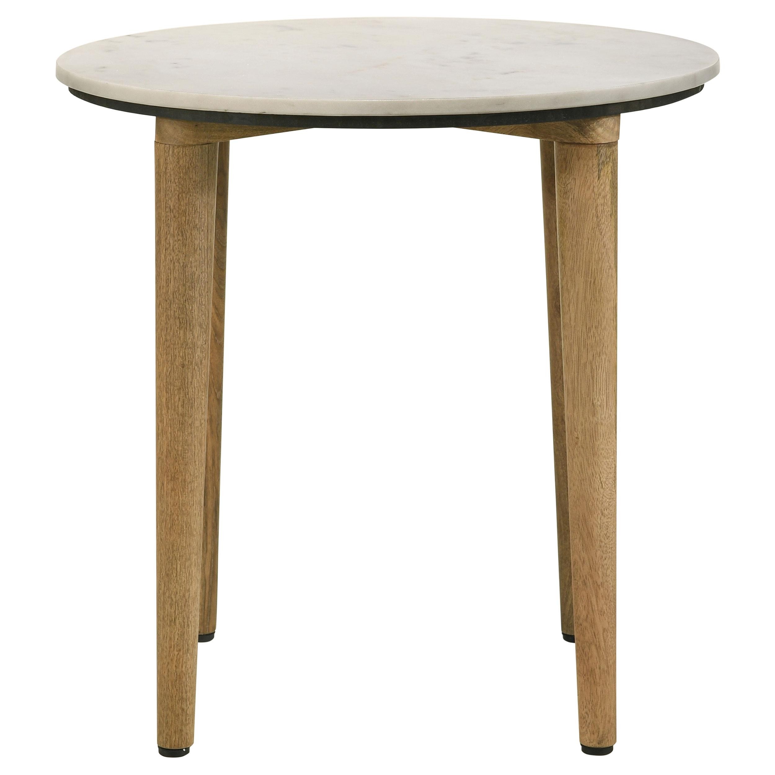 Easy, natural style offers a fresh look to a casual living space as this end table adds low-key yet elegant personality. A rustic feel and warm motif follow this round table crafted in India. Organic materials deliver an earthy aspect to easy-living furniture, with a round white and gray marble top. Tall, round tapered legs made of natural finish mango blend beautifully, both with the marble top and surrounding décor. Expect an individual and unique marble pattern on each tabletop.