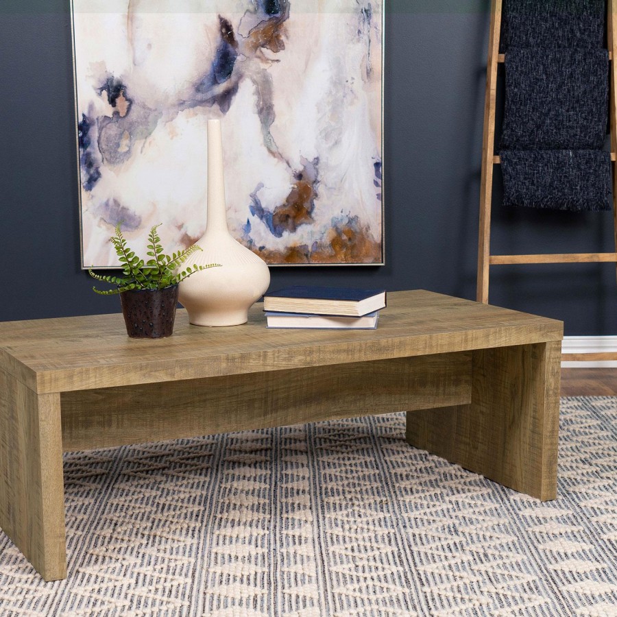 Rustic simplicity infuses a farmhouse coffee table with welcoming character. Charming in your living room, it's a clean silhouette with the look of roughhewn mango wood in a melamine paper finish. The rectangular table offers two solid sides and a center brace underneath the tabletop, offering excellent support. Warm tones highlight the finish, adding neutral appeal that brims with relaxed ambiance. Add a centerpiece to the tabletop or use it for snacks and drinks on movie nights at home.