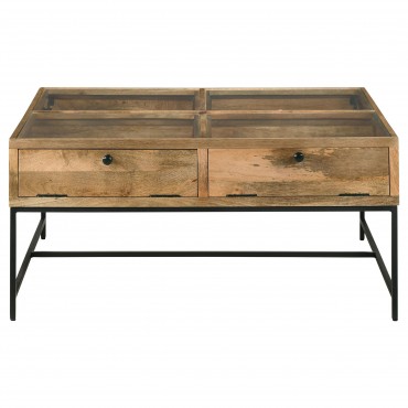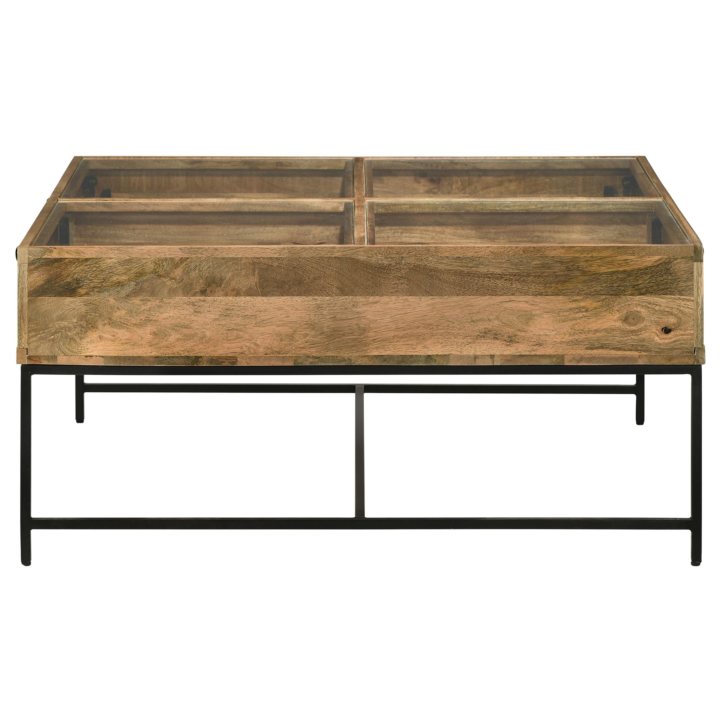 Bring farmhouse charm to your living room with this shadowbox coffee table. A tempered glass top offers a clear view of treasures stored in four compartments, accessed by drop-front doors with chain suspension for a unique touch. Crafted from solid mango wood in a warm honey brown finish, it exudes natural warmth. A sturdy iron base and black metal accents complete the mixed media look, making this table a personalized and functional focal point.