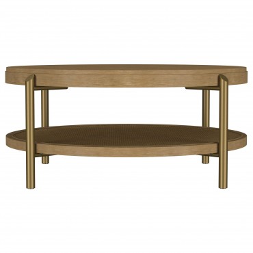 This coffee table set blends modern design with rustic elements, making it a stylish and functional addition to any space. Crafted from rubberwood, engineered wood, and ash veneer, the smooth finish highlights the natural wood grain for an organic aesthetic. Each piece features a woven rattan lower shelf for added storage and texture. Sturdy aged brass-finished metal legs provide lasting support while complementing the rustic tones. Designed for versatility, this occasional table set enhances both contemporary and classic interiors.