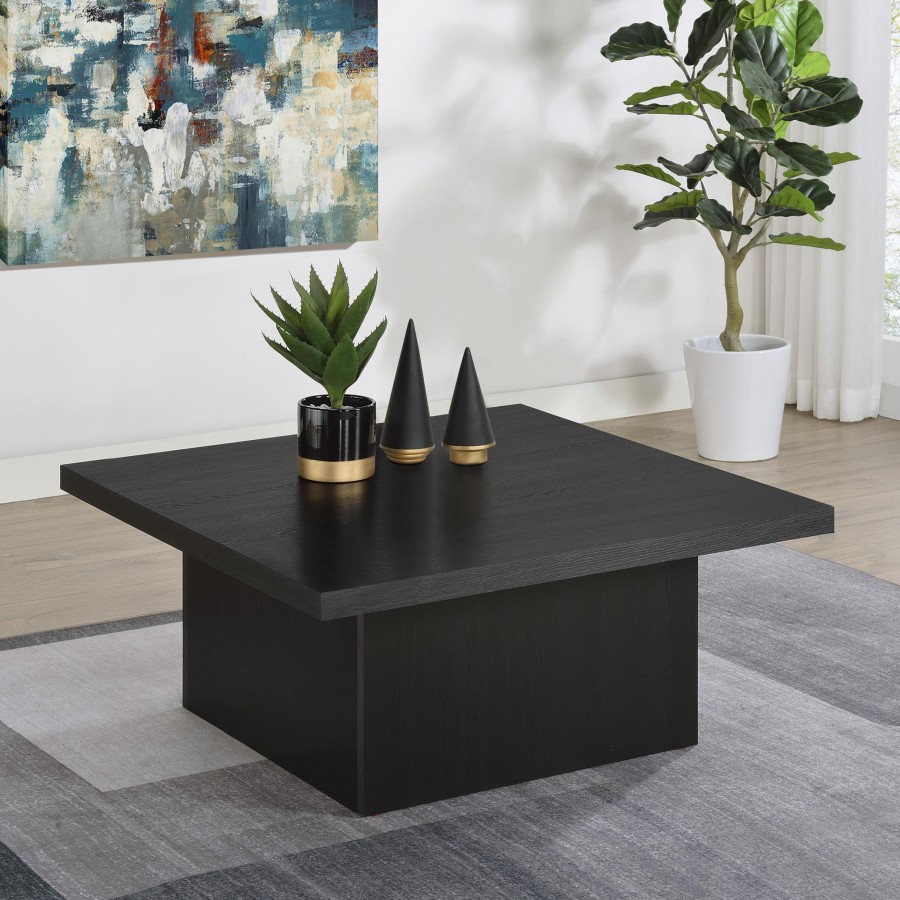 A striking coffee table built for bold presence and practical appeal. Its thick square silhouette emphasizes clean lines and sculptural symmetry, while the black finish evokes modern elegance. Crafted from engineered wood with a realistic wood grain laminate veneer, the surface offers durability and organic texture. Ideal for grounding any living room, this cocktail table brings weight and refinement to contemporary spaces.