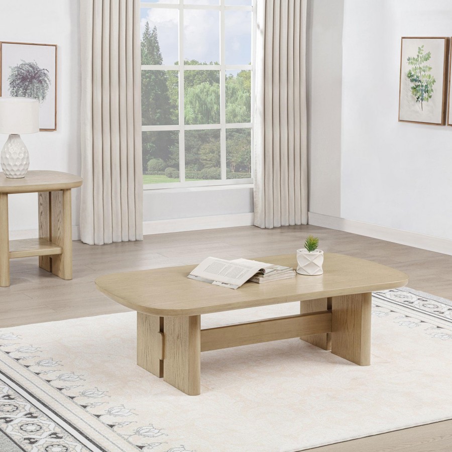 This coffee table set embodies California coastal modern design, blending authenticity with relaxed sophistication. Each piece features a sculpted underside and gently rounded edges, creating a light yet substantial presence. Built from solid poplar, engineered wood, and oak veneer in a beige oak finish, the set offers natural warmth and enduring strength. A spacious cocktail table pairs beautifully with matching end table featuring a lower shelf for versatile function and timeless style.